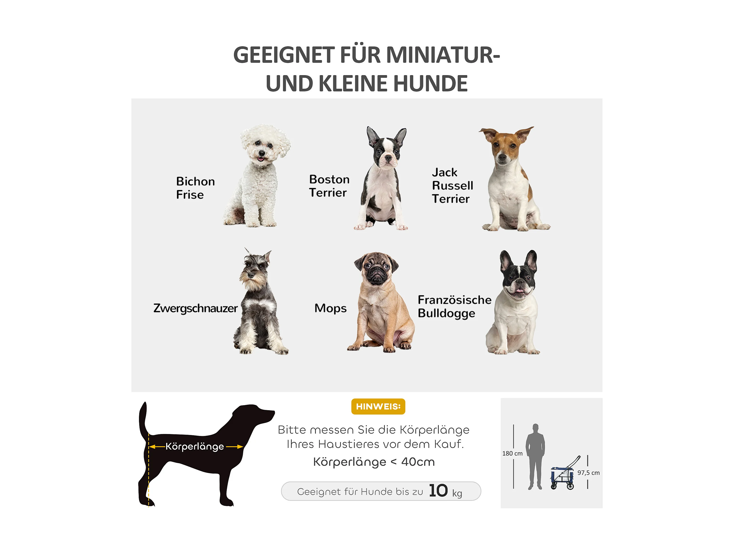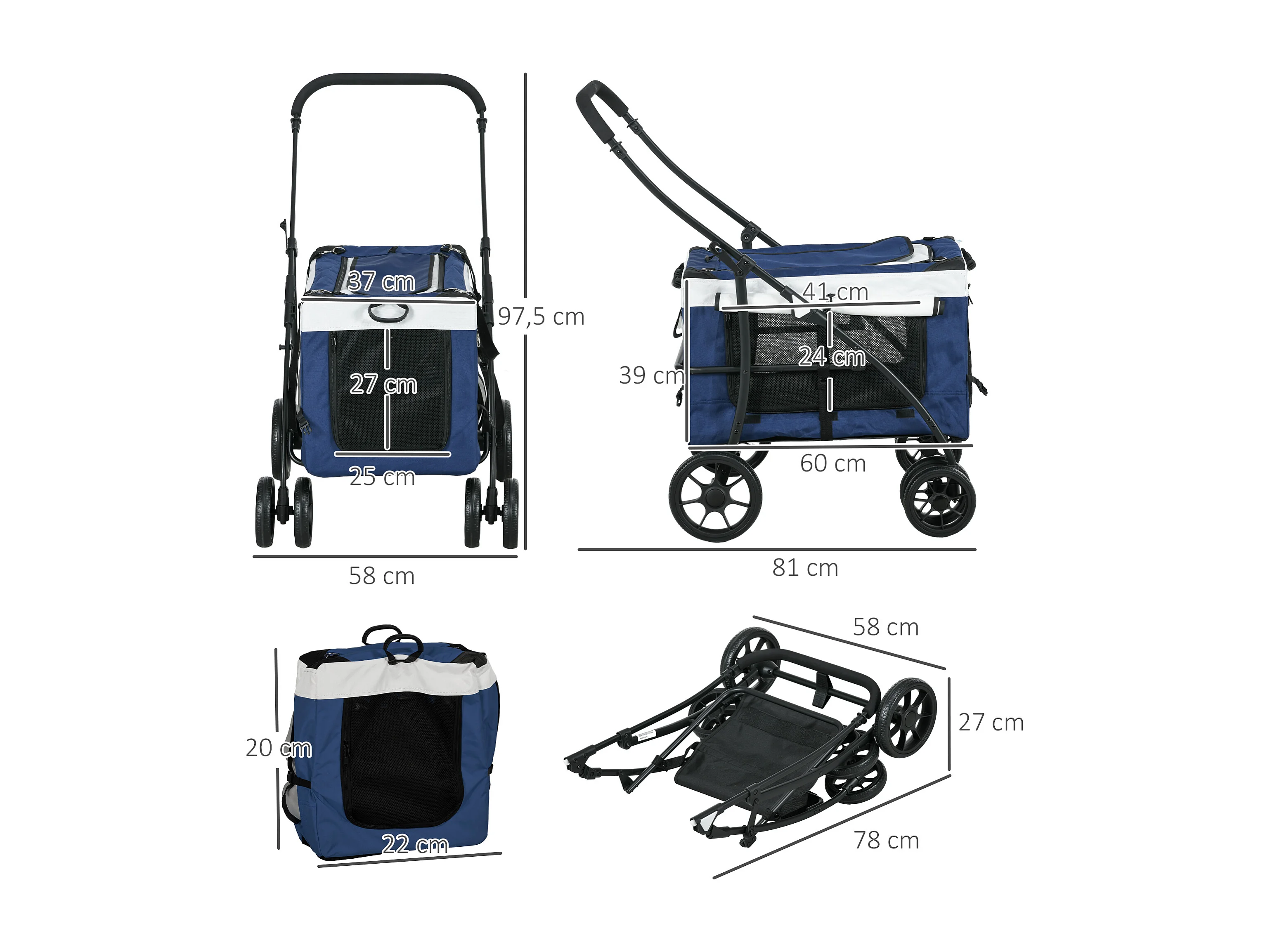 Poussette pliante pour chien et chat jusqu'à 4 kg, polyester, bleu foncé, avec fenêtres en filet et rangement (76x44x103 cm)