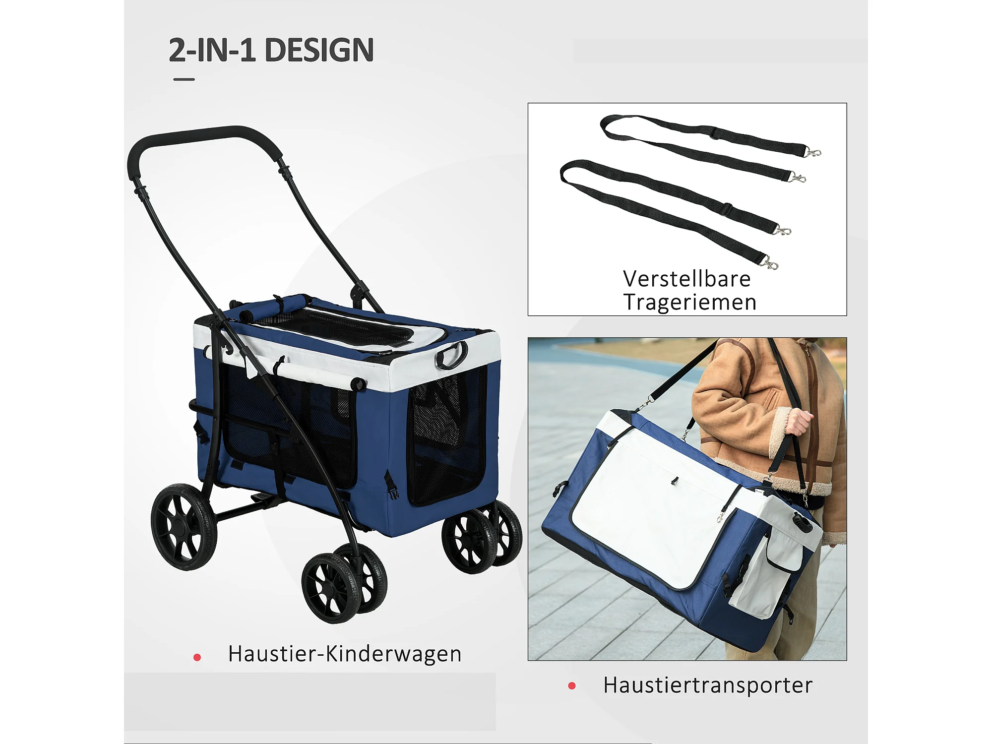 Poussette 2 en 1 pour chien, panier amovible, polyester, bleu, avec 2 laisses de sécurité et pliable (81x58x97.5cm)