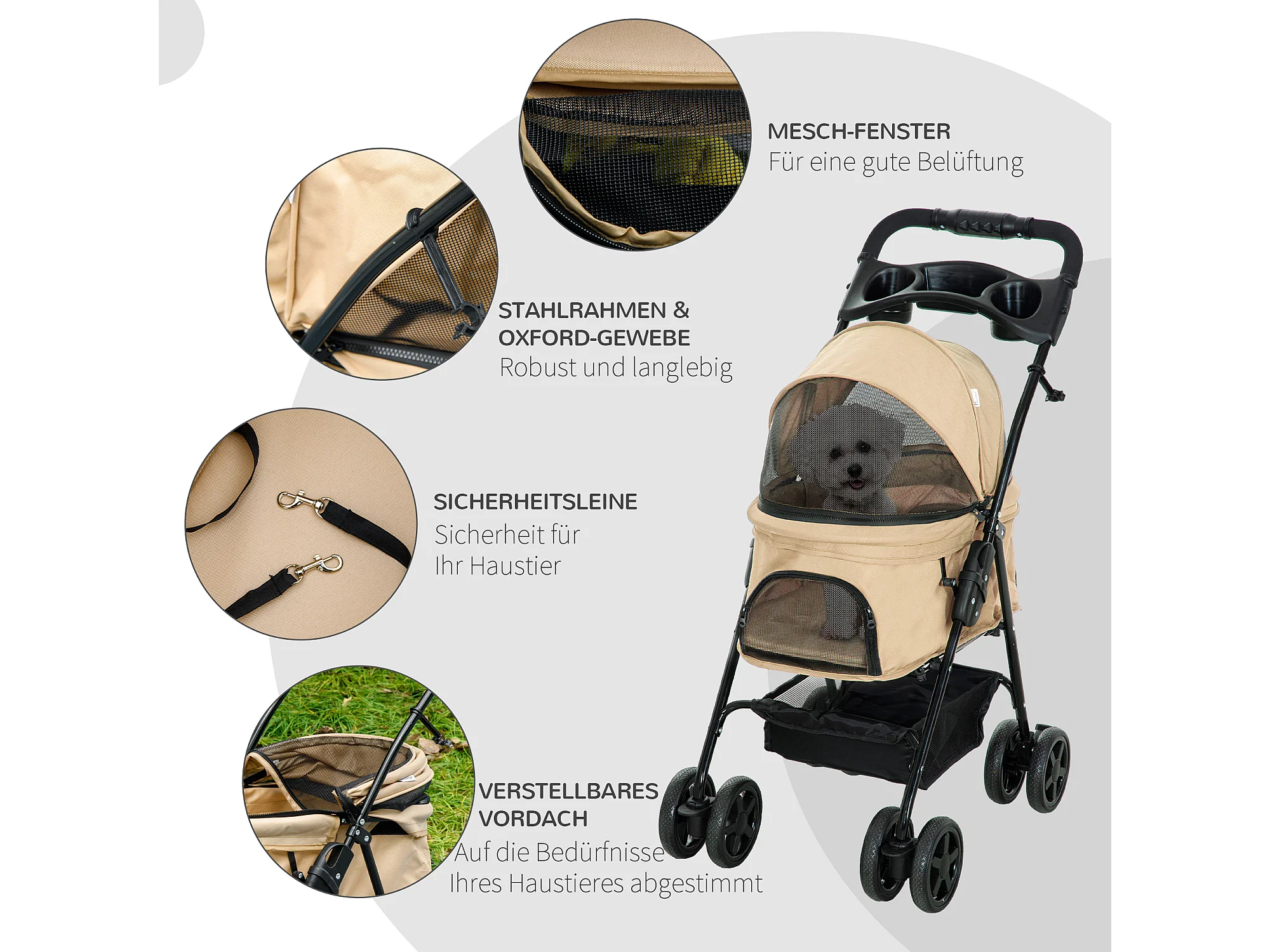 Poussette pliable pour chien et chat avec housse anti-pluie, polyester, kaki (80.5x51.5x100cm)