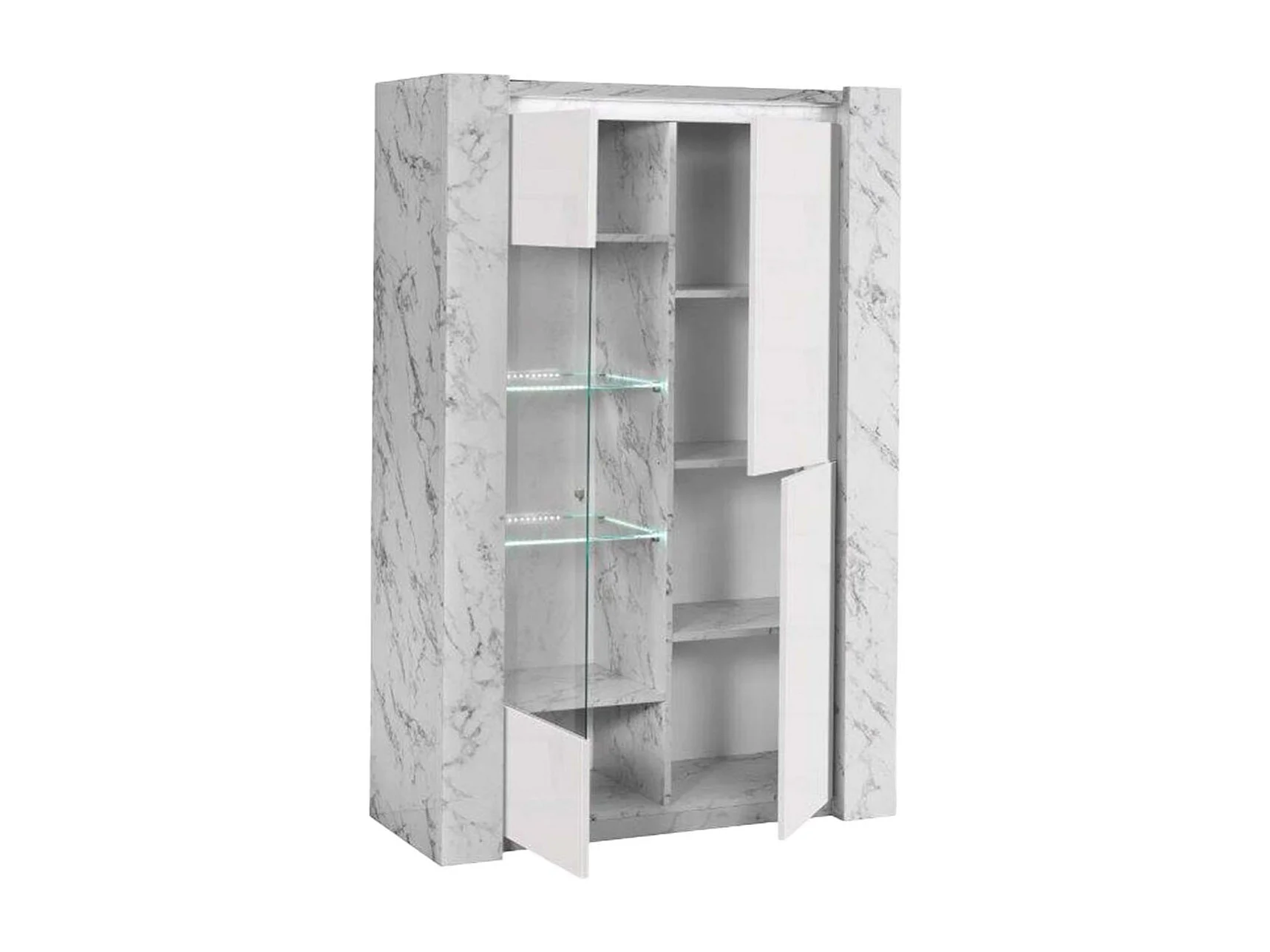 PRAVA - Ensemble Séjour Blanc et Effet Marbre Table 190cm + Vitrine avec Leds