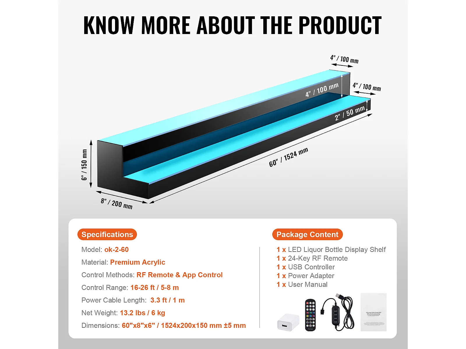 Présentoir de Bouteilles d'Alcool SucceBuy, Éclairé par LED en 2 Étapes, Étagère de Bar 152,4 cm, Contrôle RF et Application