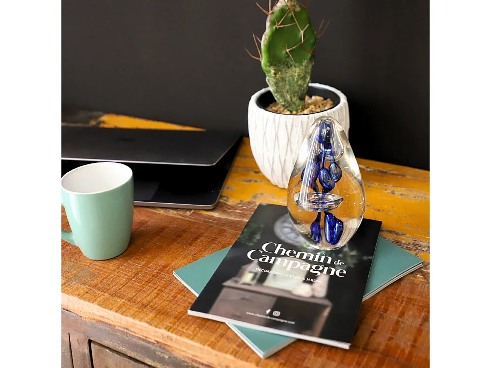 Presse papier sulfure "Flammes" en verre bleu 9 x 6 cm