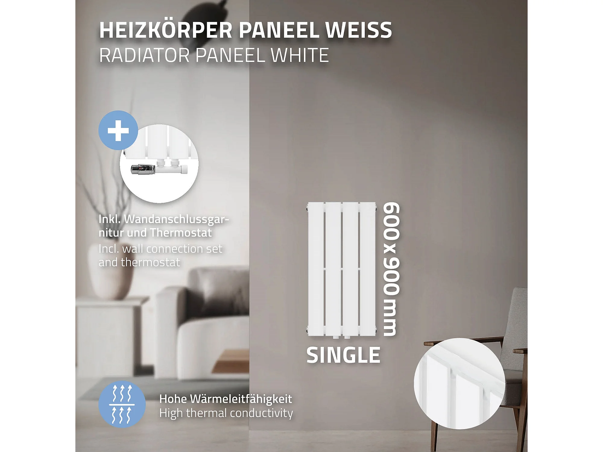 Radiateur blanc salle de bain monocouche 300x600 mm raccord universel thermostat