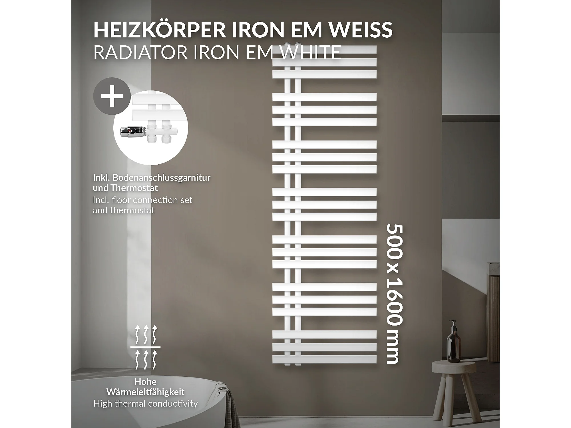 Radiateur de Salle de Bain Iron EM 500x1600 mm Blanc Raccord Central au Bas avec Garniture