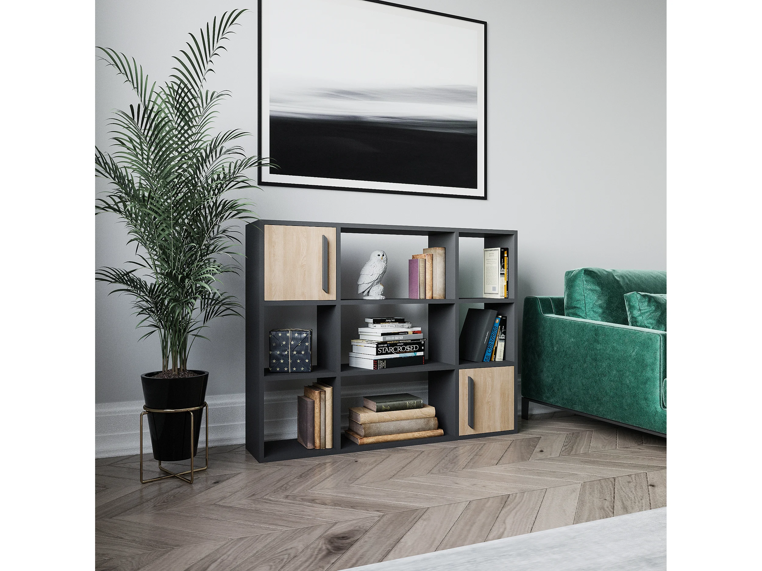 Randall Bibliothèque Rangement avec 2 Armoires et 7 Niches | Dos nu (Anthracite et Chêne)