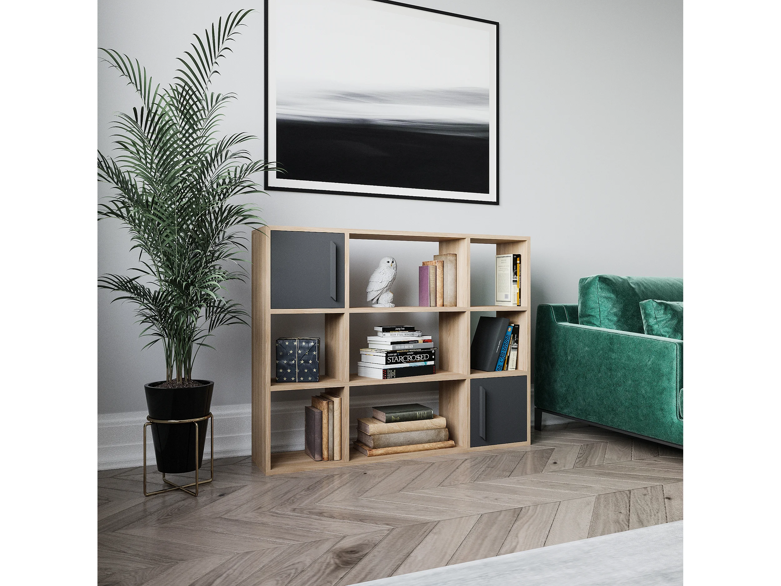 Randall Bibliothèque Rangement avec 2 Armoires et 7 Niches | Dos nu (Chêne et Anthracite)
