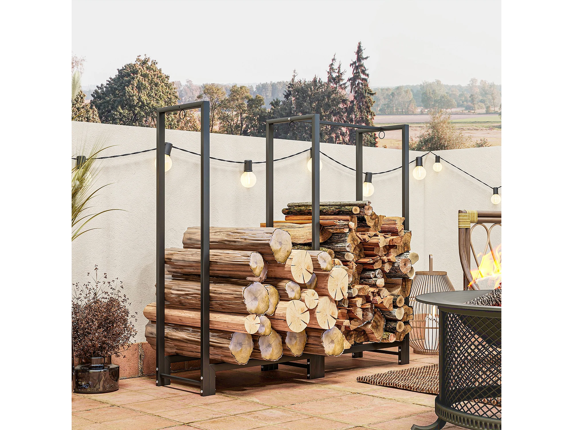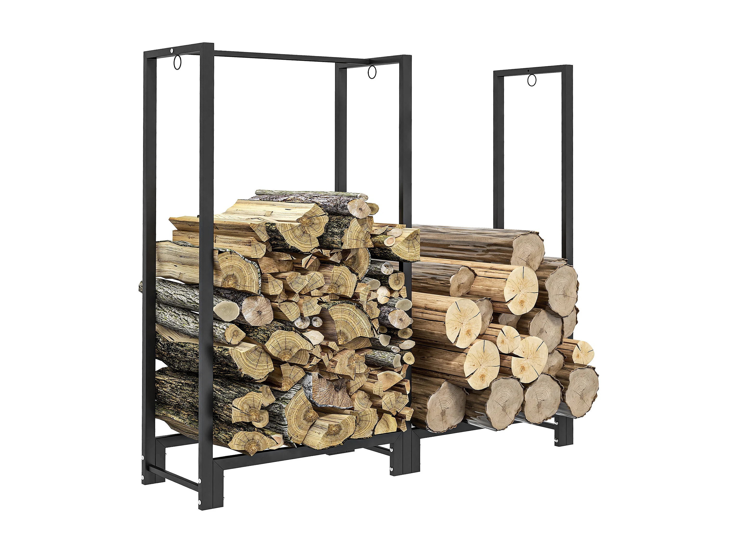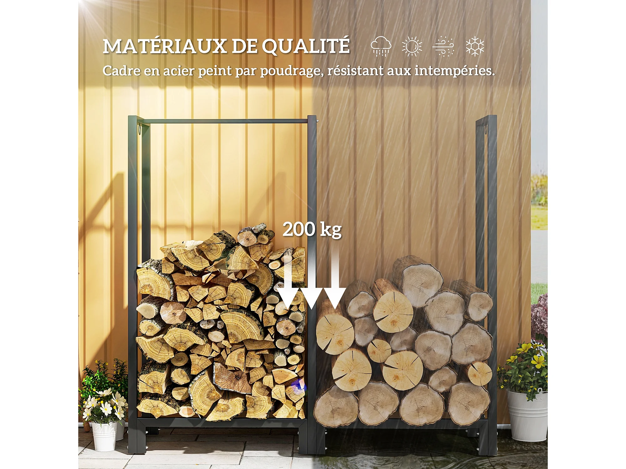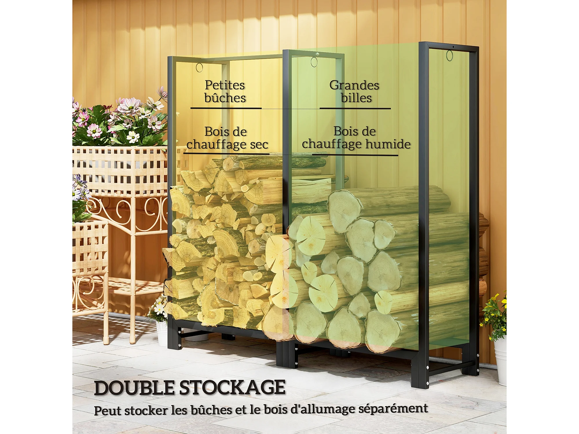 Range-bûches intérieur extérieur sur pied - 2 compartiments 3 crochets - dim. 123L x 32l x 115H cm - acier noir