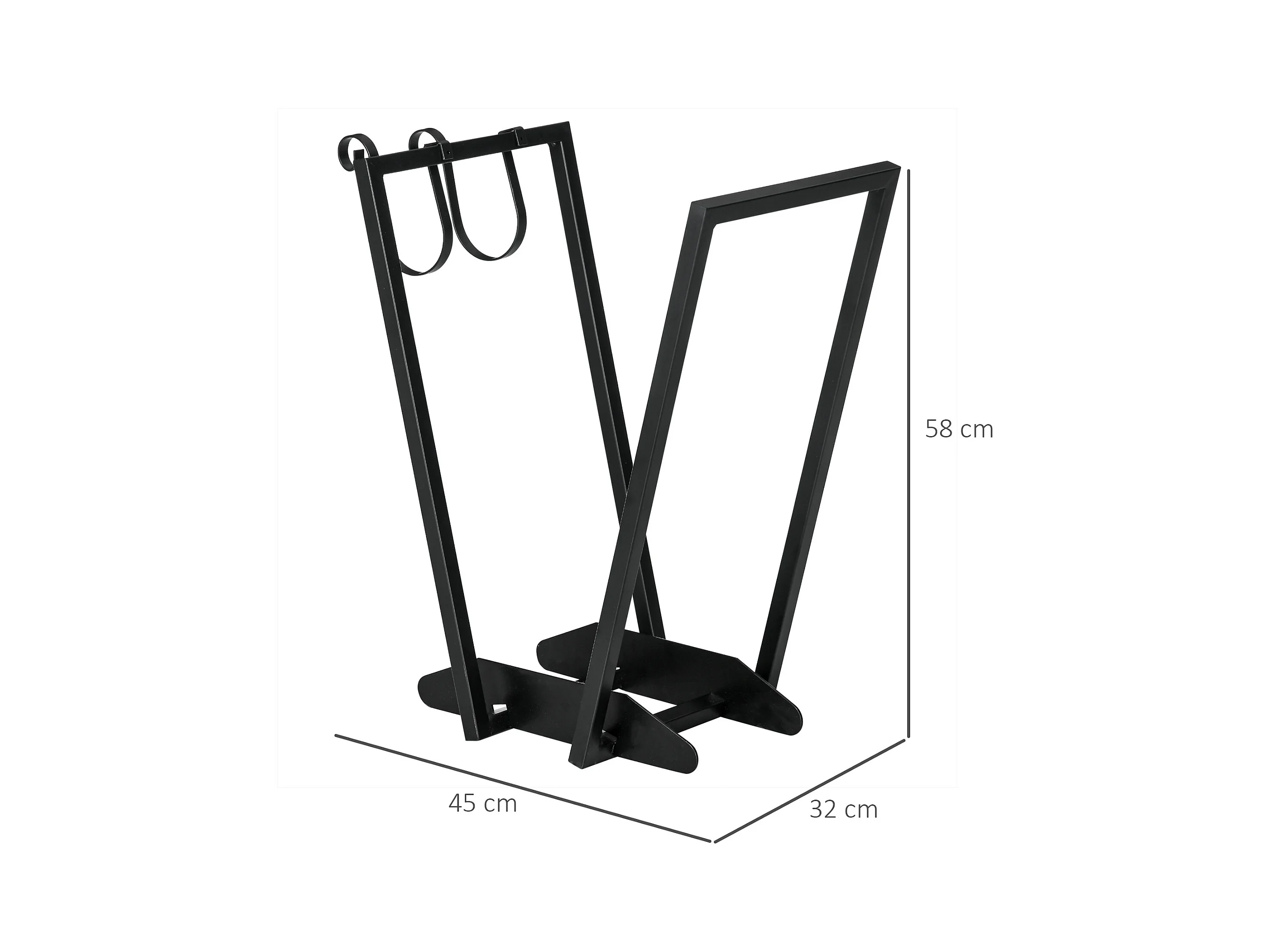 Range-bûches porte bûche range bois de chauffage en acier design trapézoïdal avec 2 crochets et étagère inférieure pour intérieur et extérieur 45 x 32 x 58 cm noir