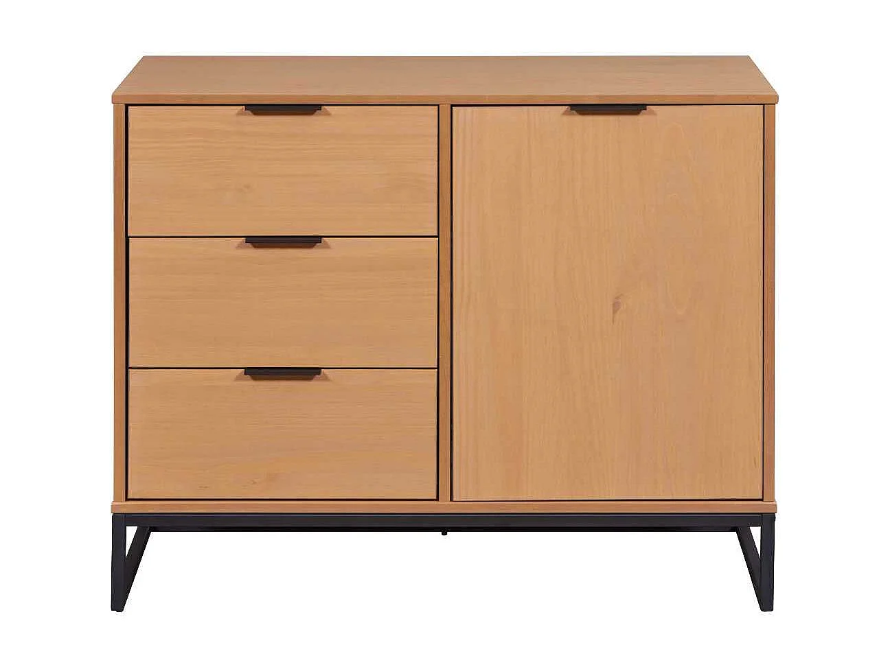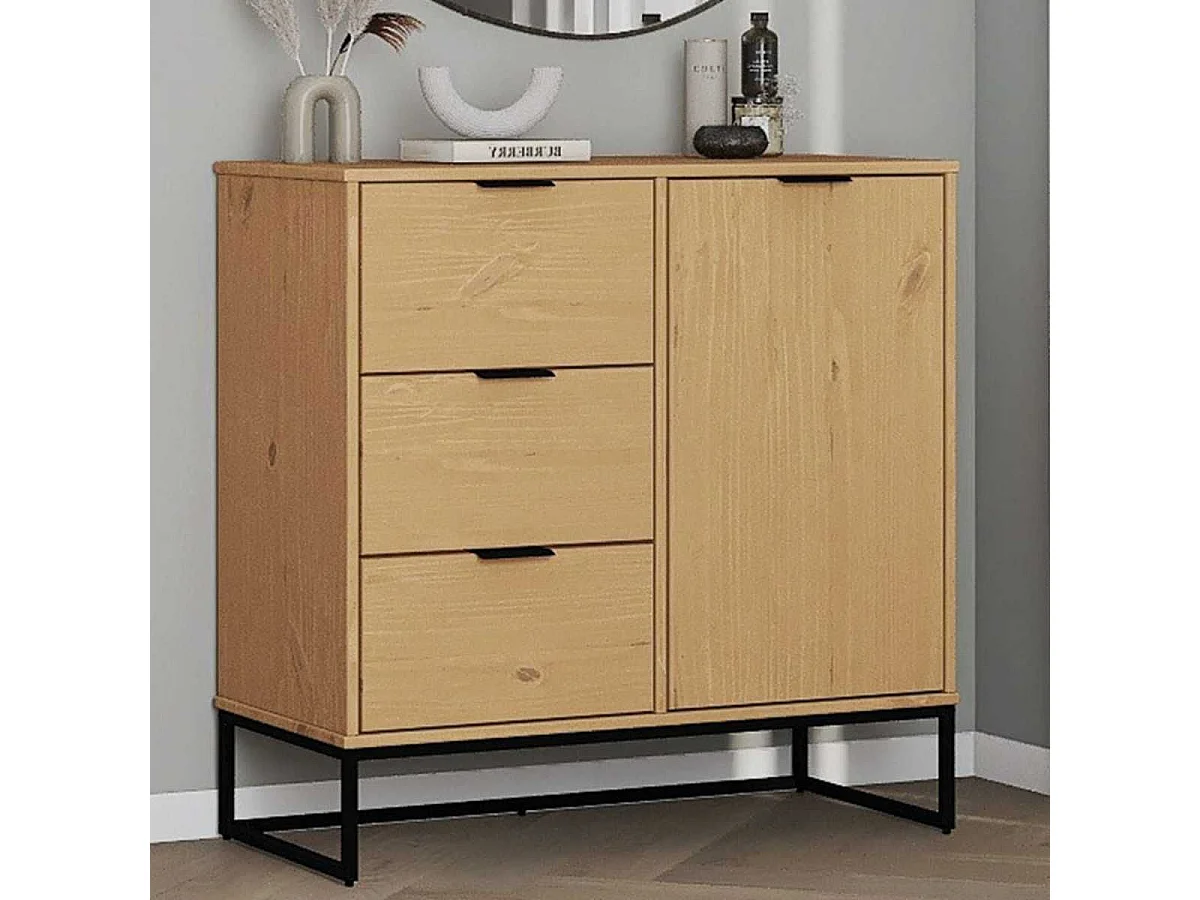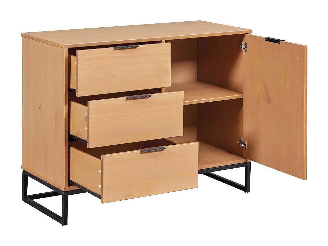 Rangement 1 porte 3 tiroirs en pin massif teinté chêne piètement noir - CATHY