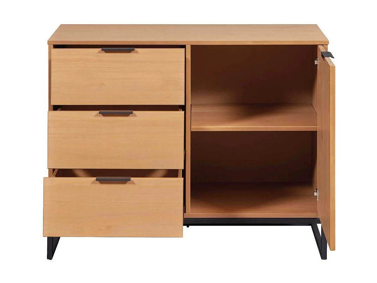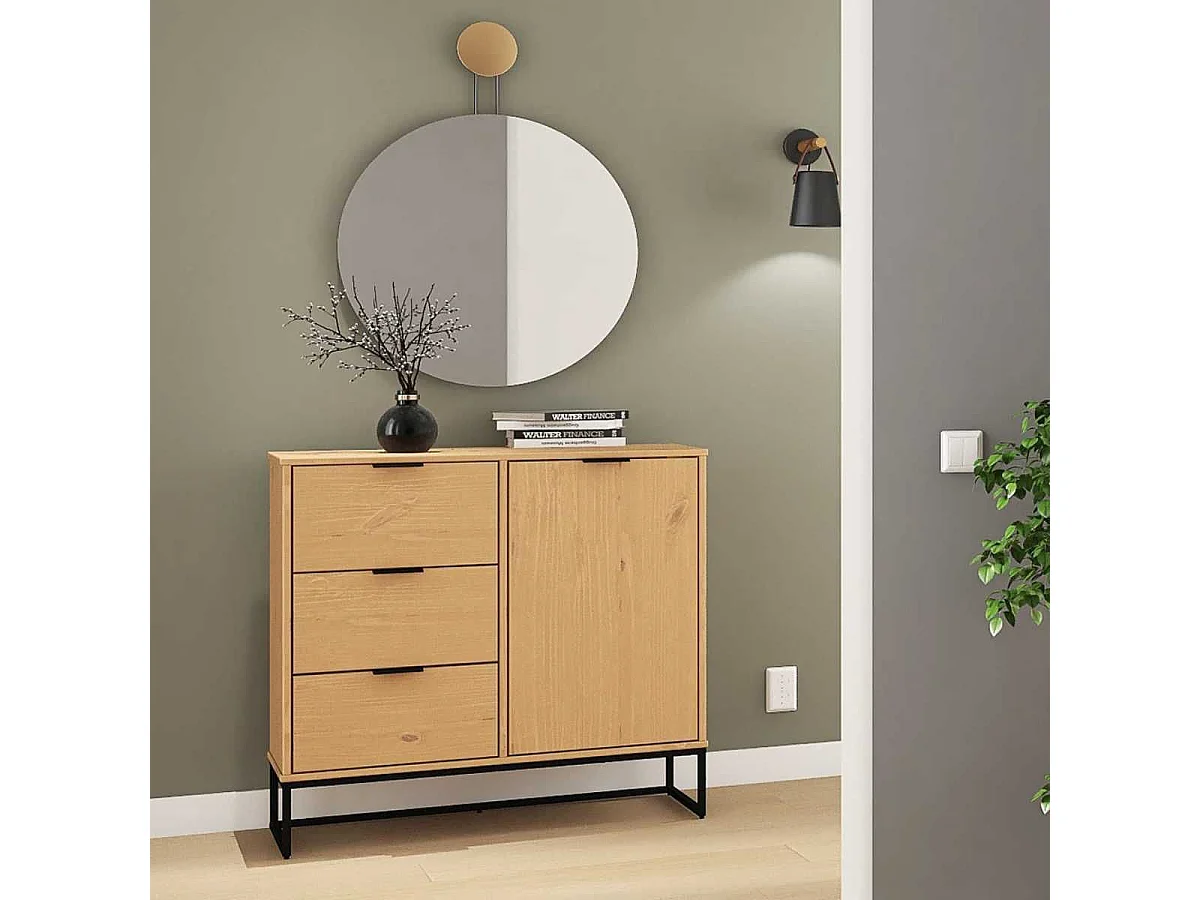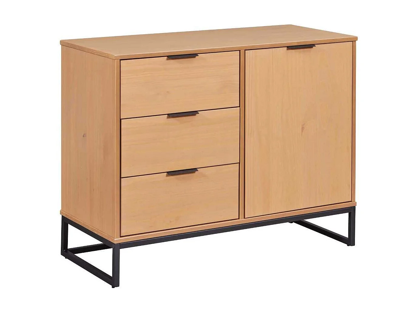 Rangement 1 porte 3 tiroirs en pin massif teinté chêne piètement noir - CATHY