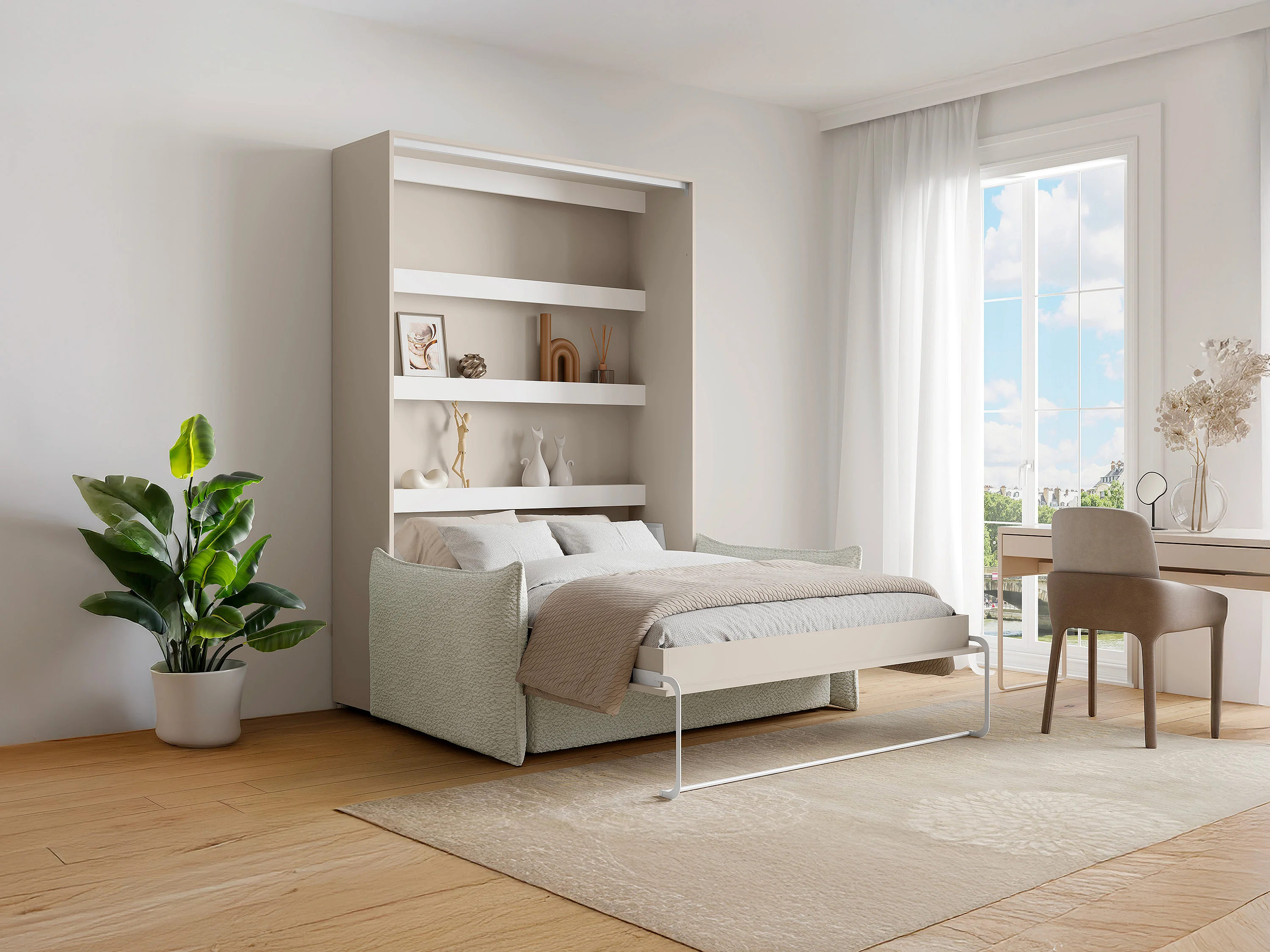 Lit escamotable 140 x 200 cm - Ouverture verticale manuelle - Avec LEDs - Beige + Matelas + Canapé - RAPILI