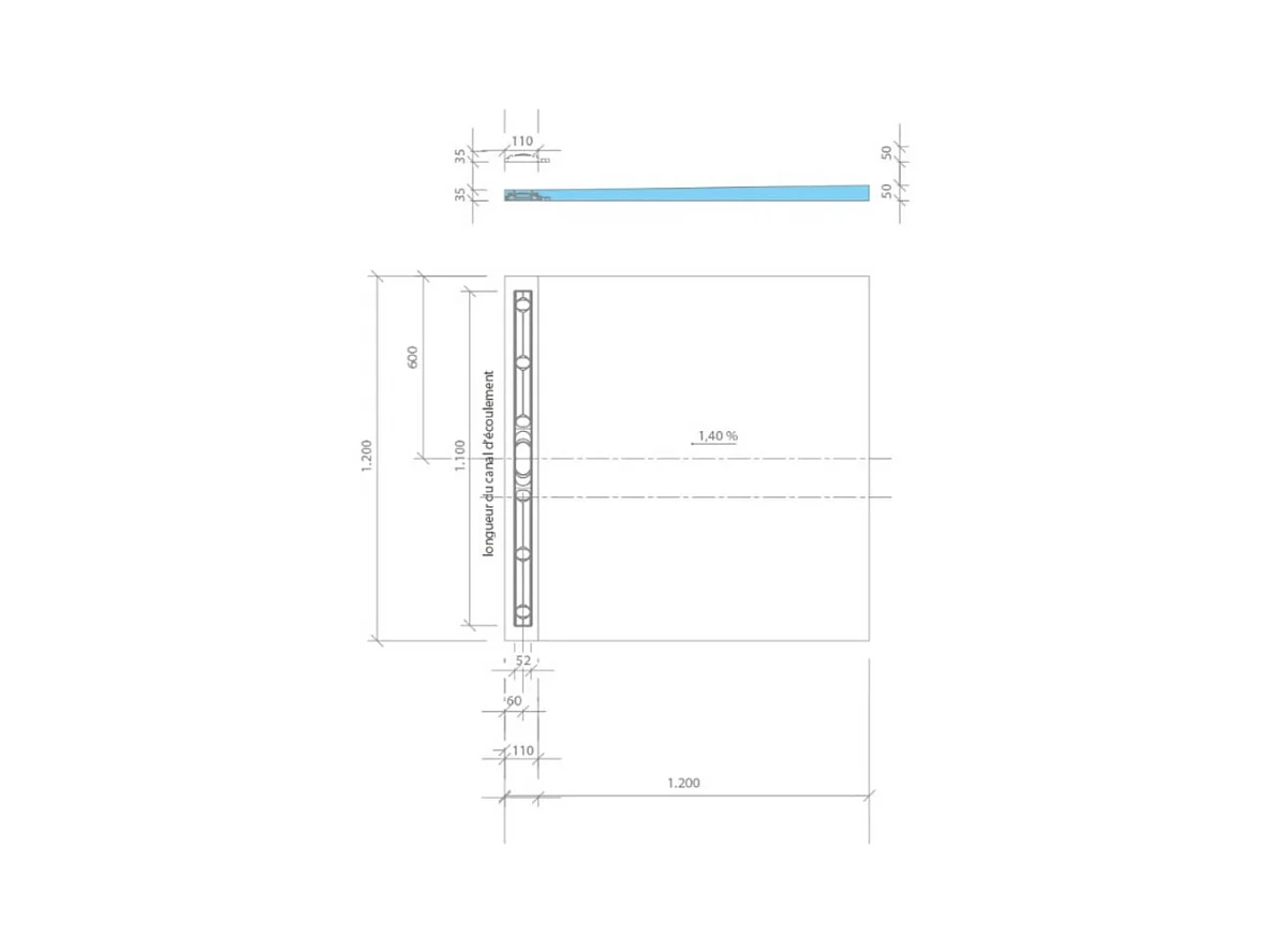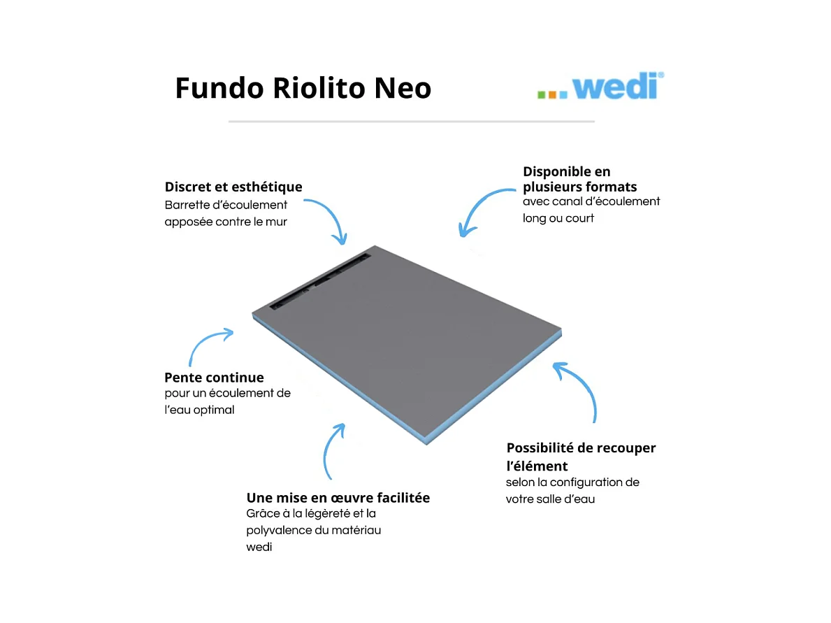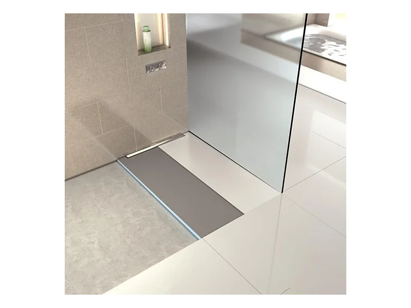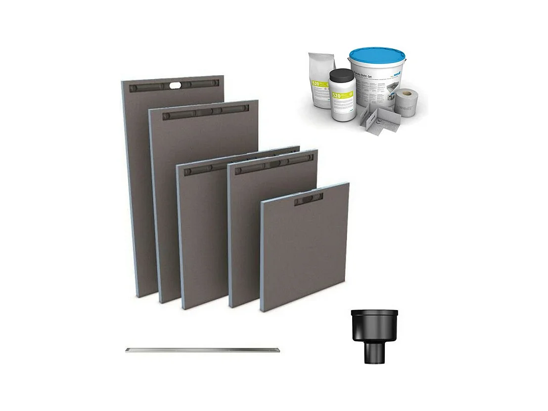 Receveur à carreler WEDI Fundo Riolito Neo + barrette de finition inox + bonde vertical + kit d'étanchéité 120 x 120 cm