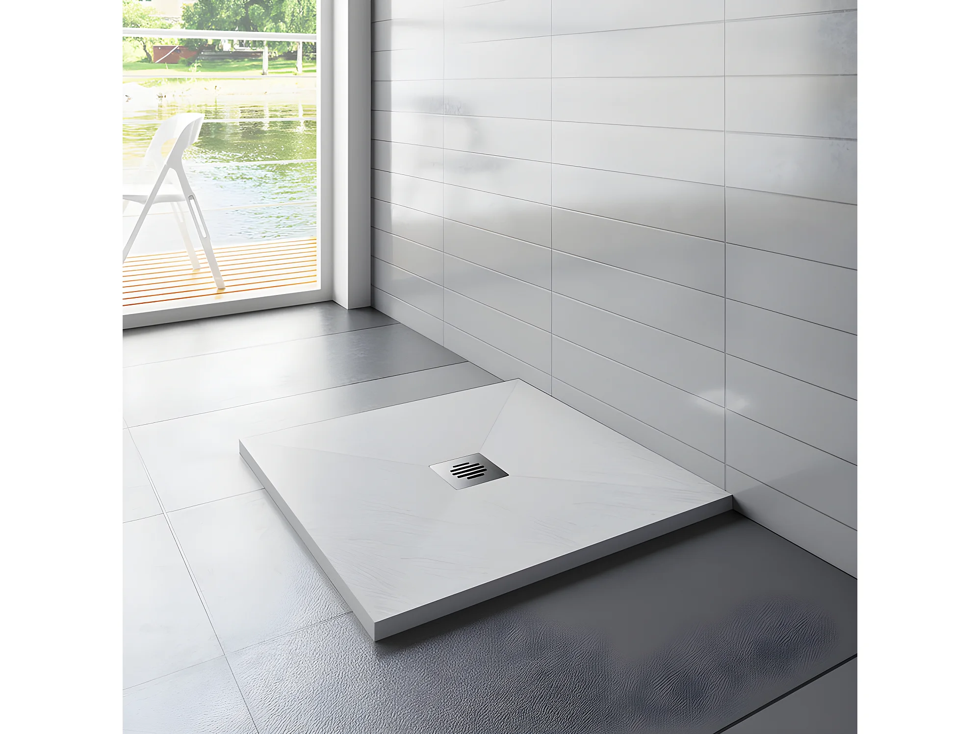 Receveur de douche 90x90cm avec une grille en Inox, bac à douche carré, Extra-plat, blanc, anti-dérapant