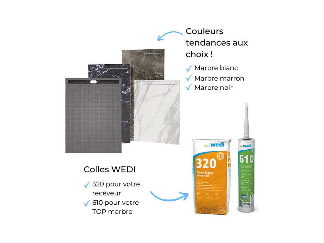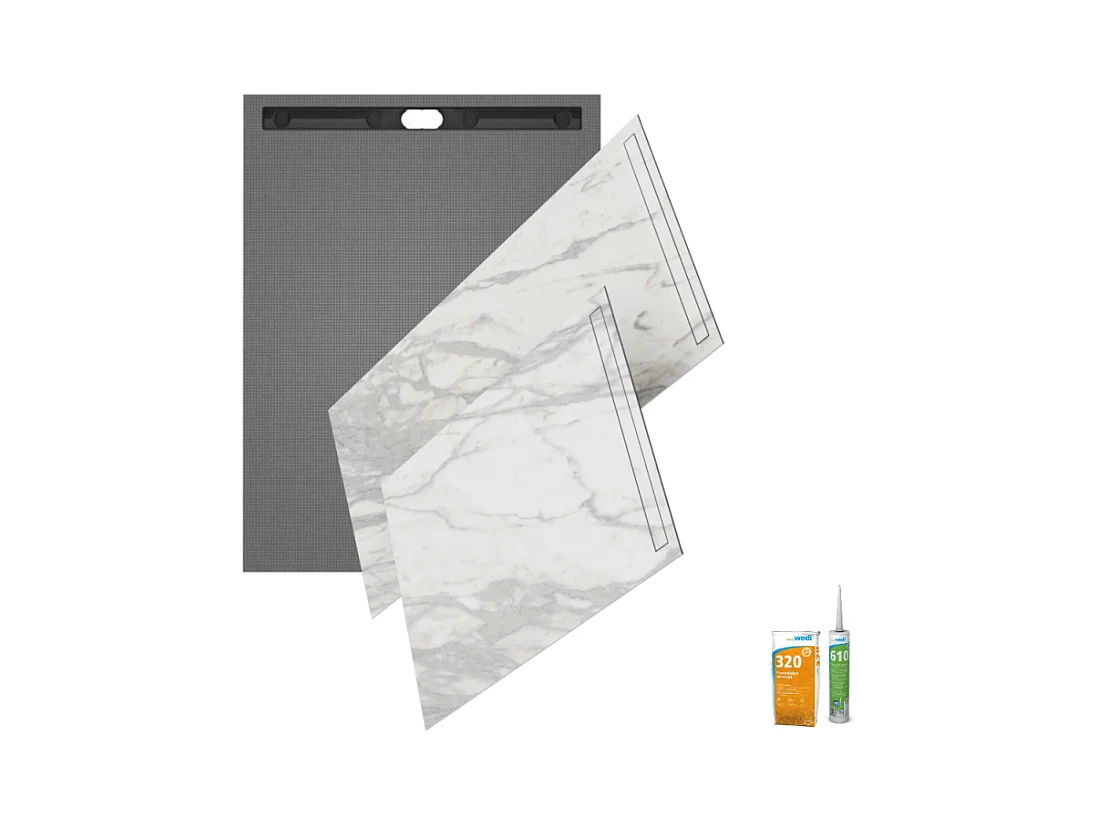 Receveur de douche à carreler 180 x 90 WEDI Fundo Riolito Neo + revêtement Top marble white + colle