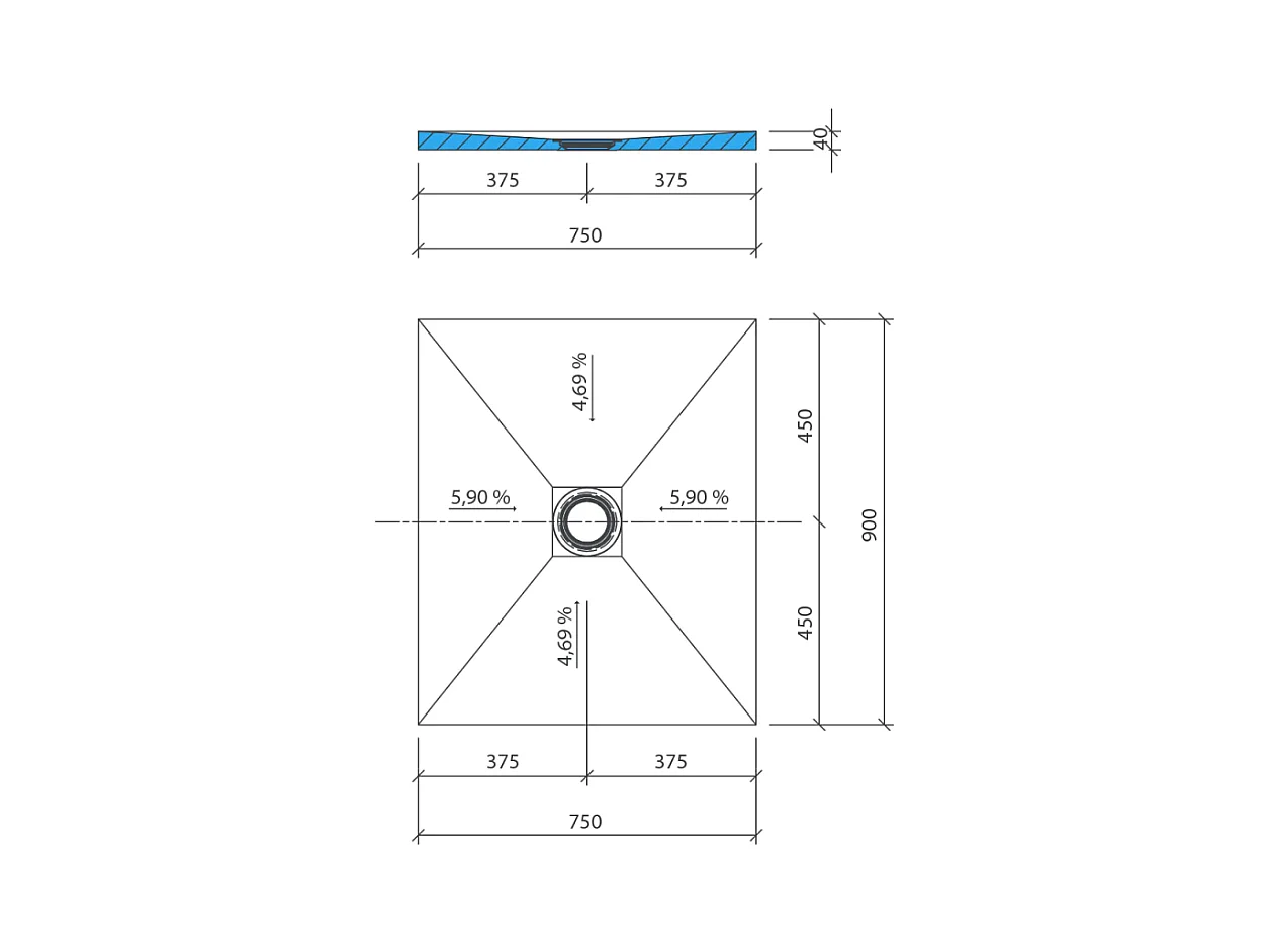 Receveur de douche à carreler 90 x 75 WEDI Fundo Primo écoulement centré + bonde verticale + kit d'étanchéité + colle 320