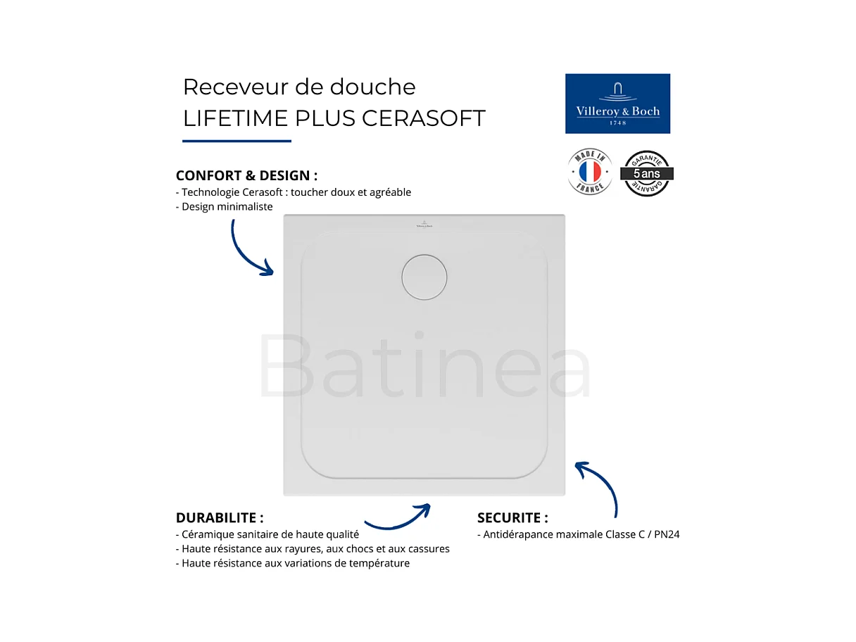 Receveur de douche antidérapant 80 x 80 VILLEROY ET BOCH Lifetime Plus Cerasoft céramique blanc