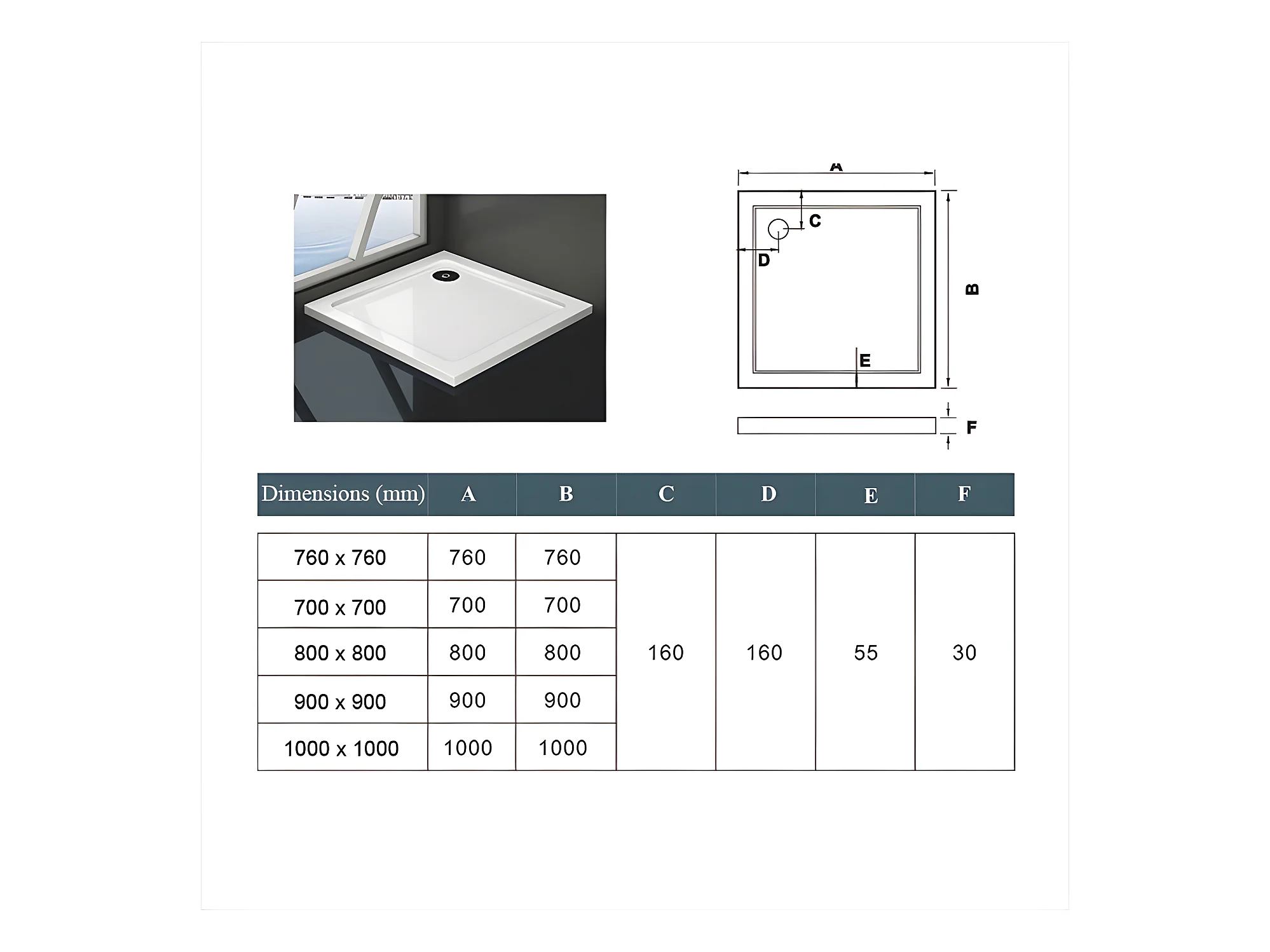 Receveur de douche blanc 80x80cm carré, Extra-plat, bac à douche avec kit de plinthe, 8 pieds, bonde de receveur et siphon 90cm