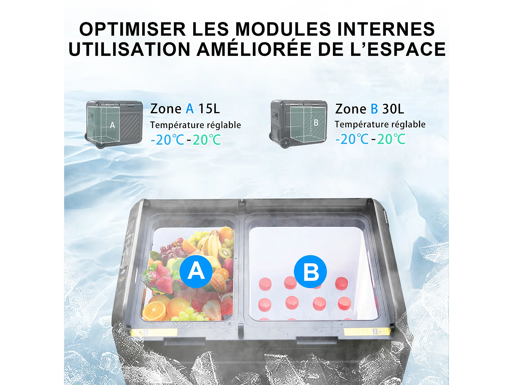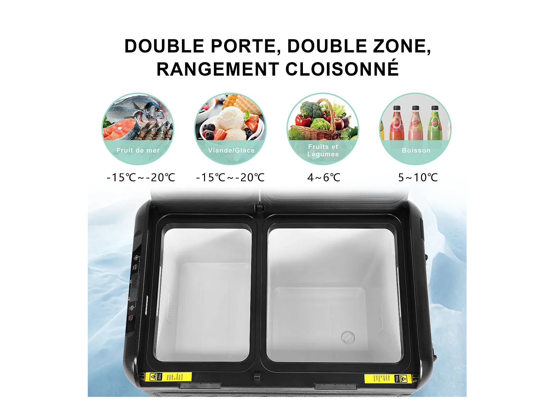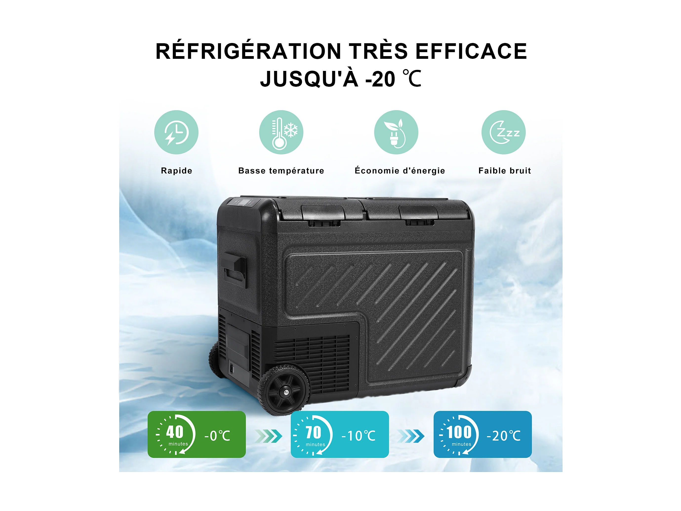 Glacière électrique double zone pour voiture, 45 L, 12 V, 240 V, portable, avec roulettes, noire
