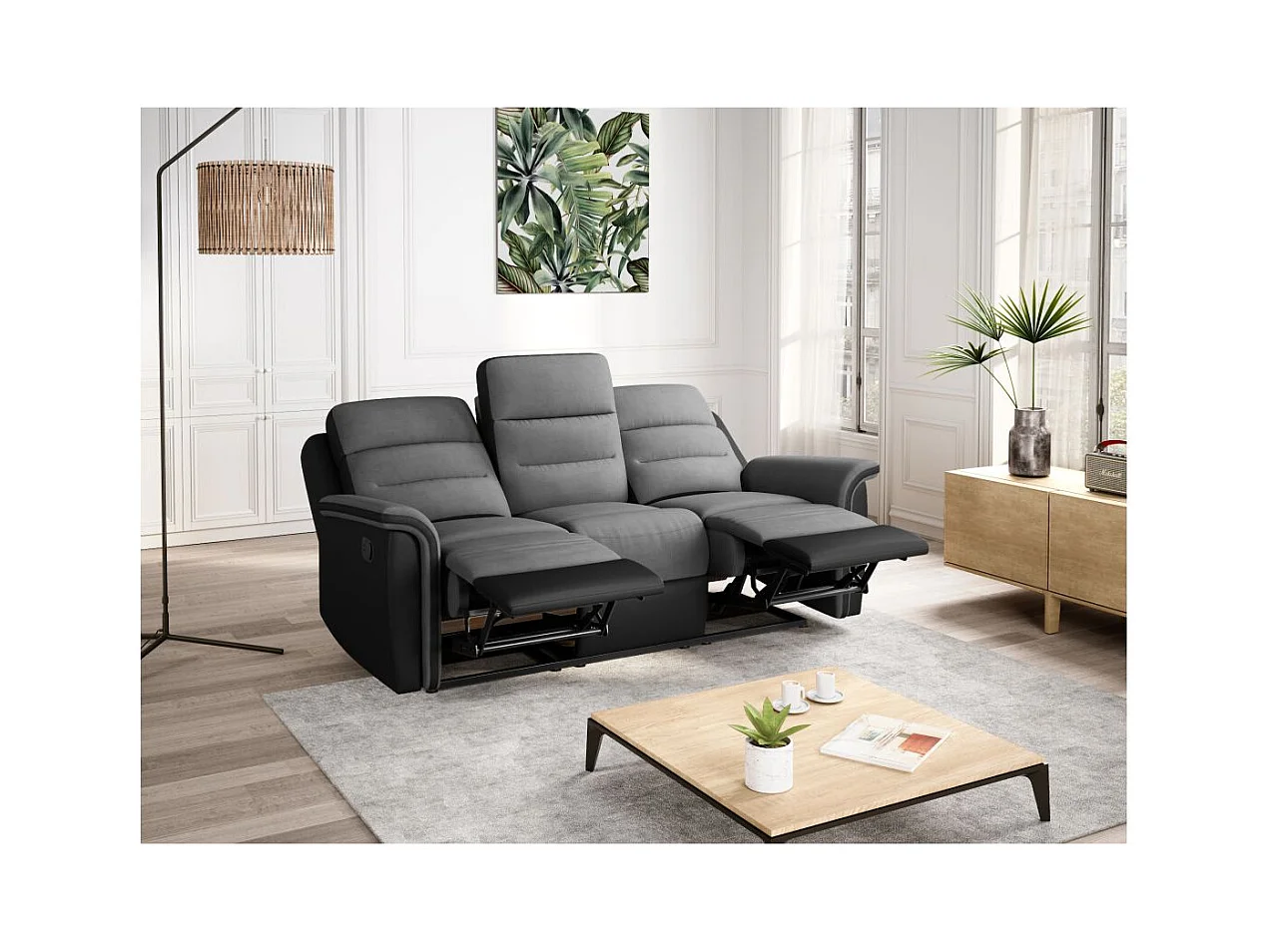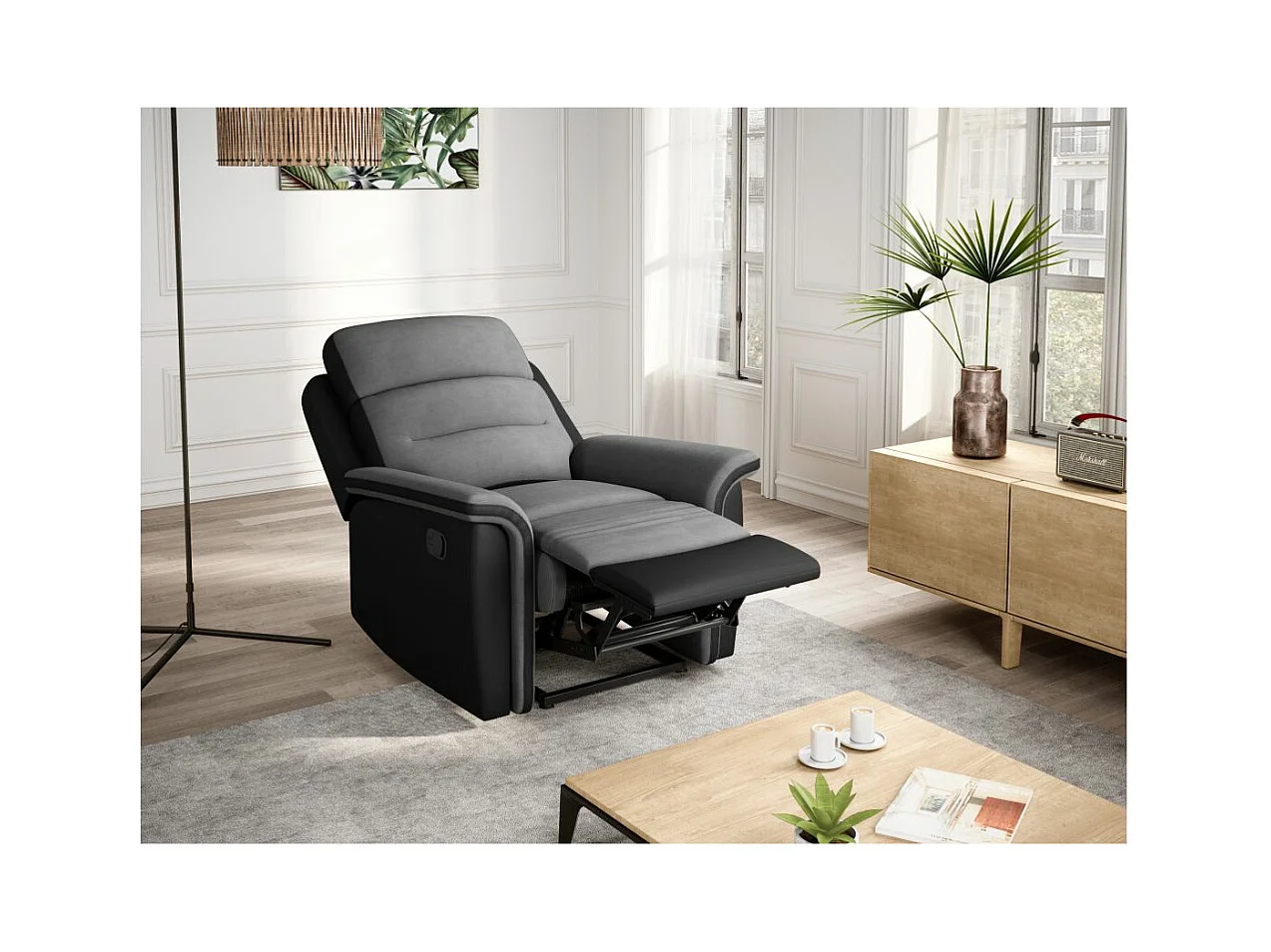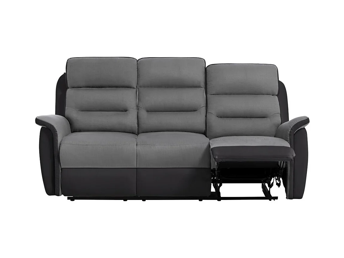 Ensemble canapé relax manuel Léon 3 places + fauteuil manuel en microfibre et simili Gris/noir - Loungitude