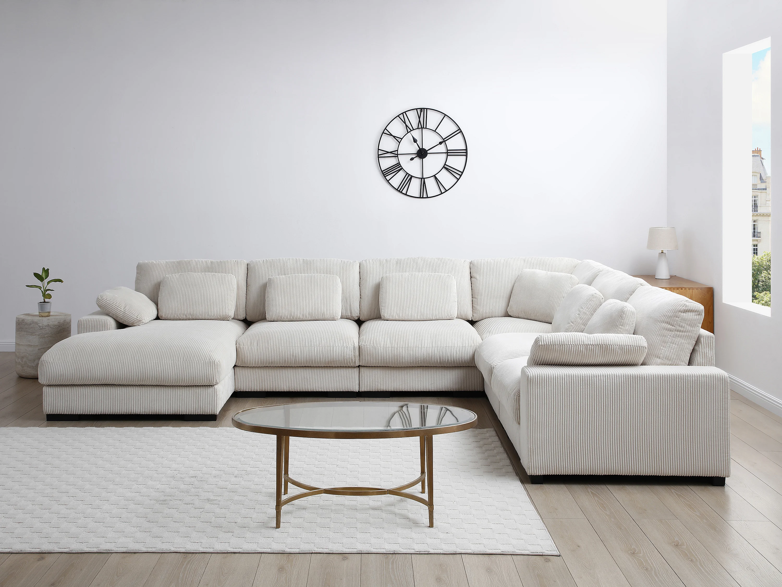 Grand canapé d'angle gauche panoramique en velours côtelé beige RIADOPI