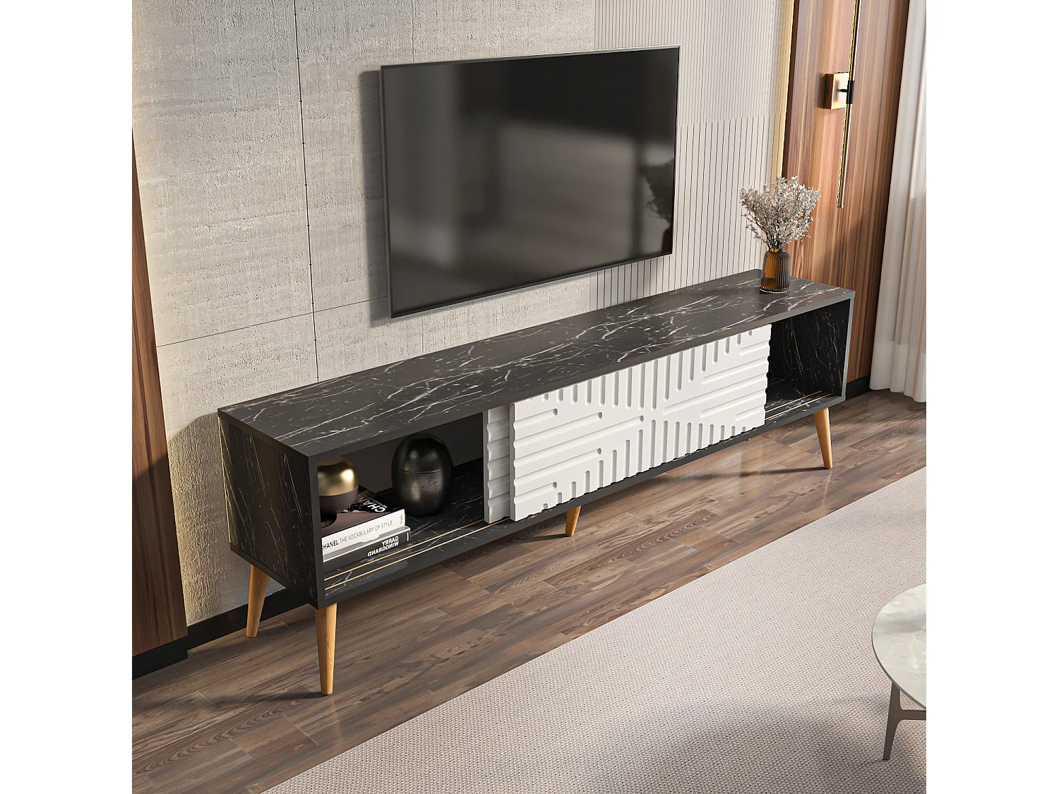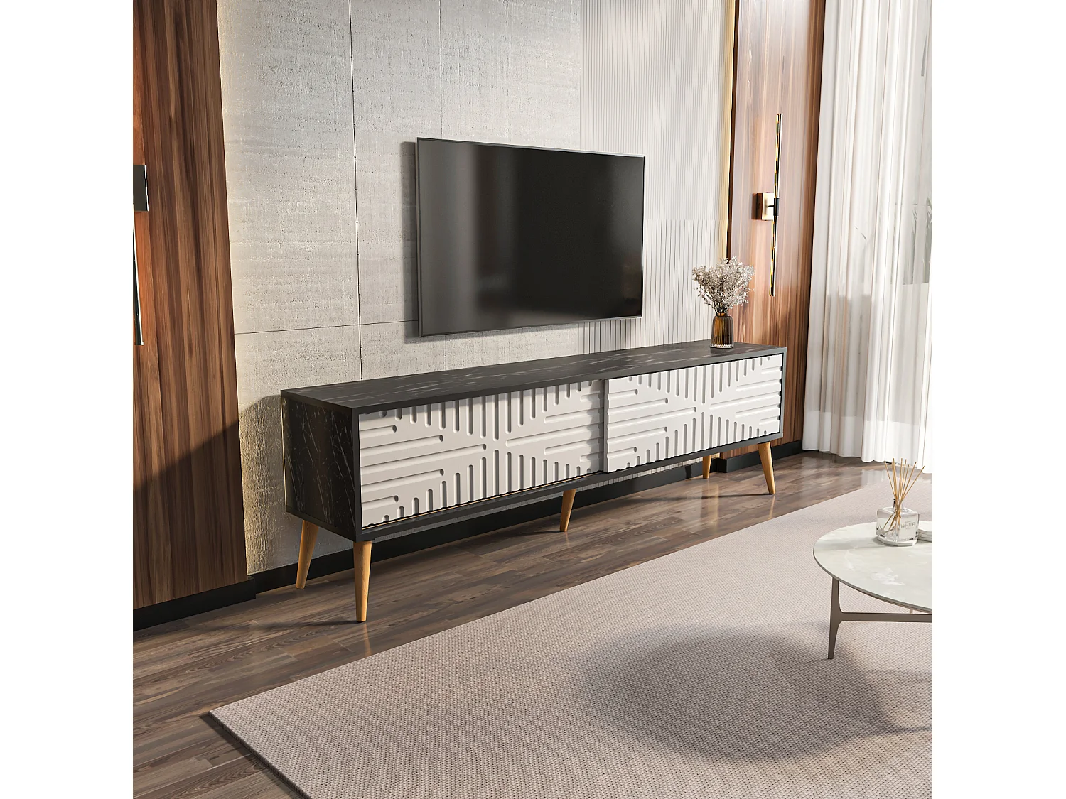 Meuble TV 2 portes et 1 étagères Ribera 180cm Bois foncé et Effet marbre Noir