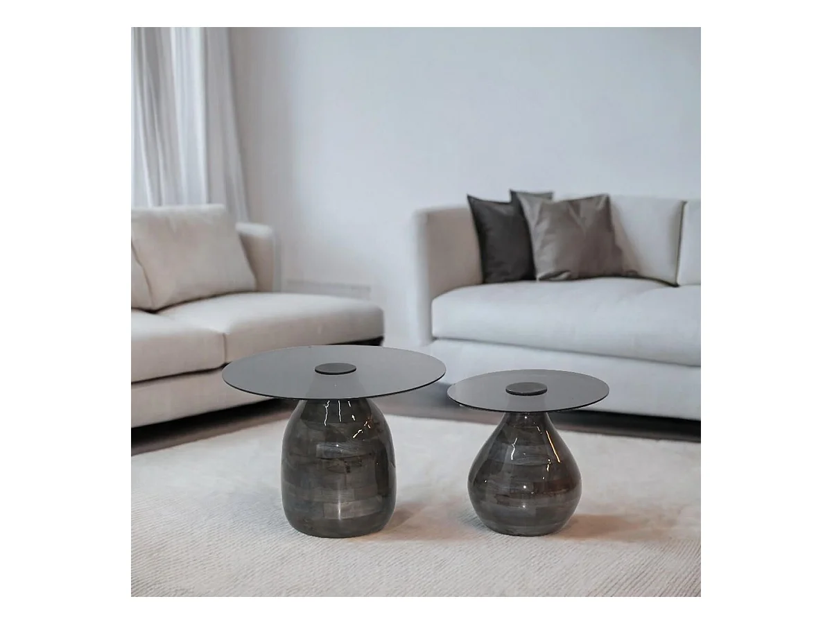 SALIM - Lot de 2 Tables Basse en Verre Fumé Noir Piètement en Manguier Vernis Gloss