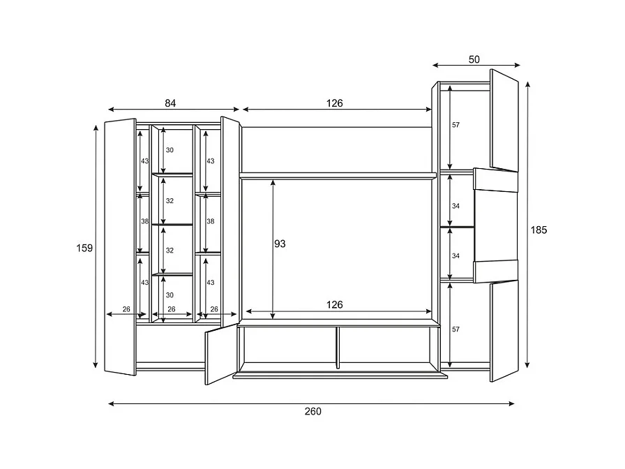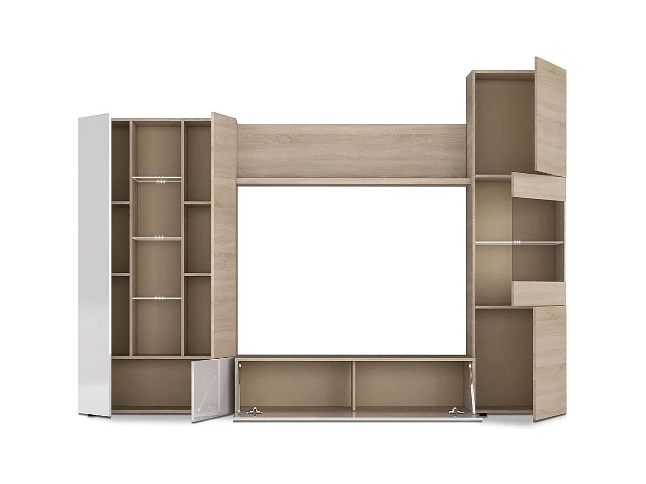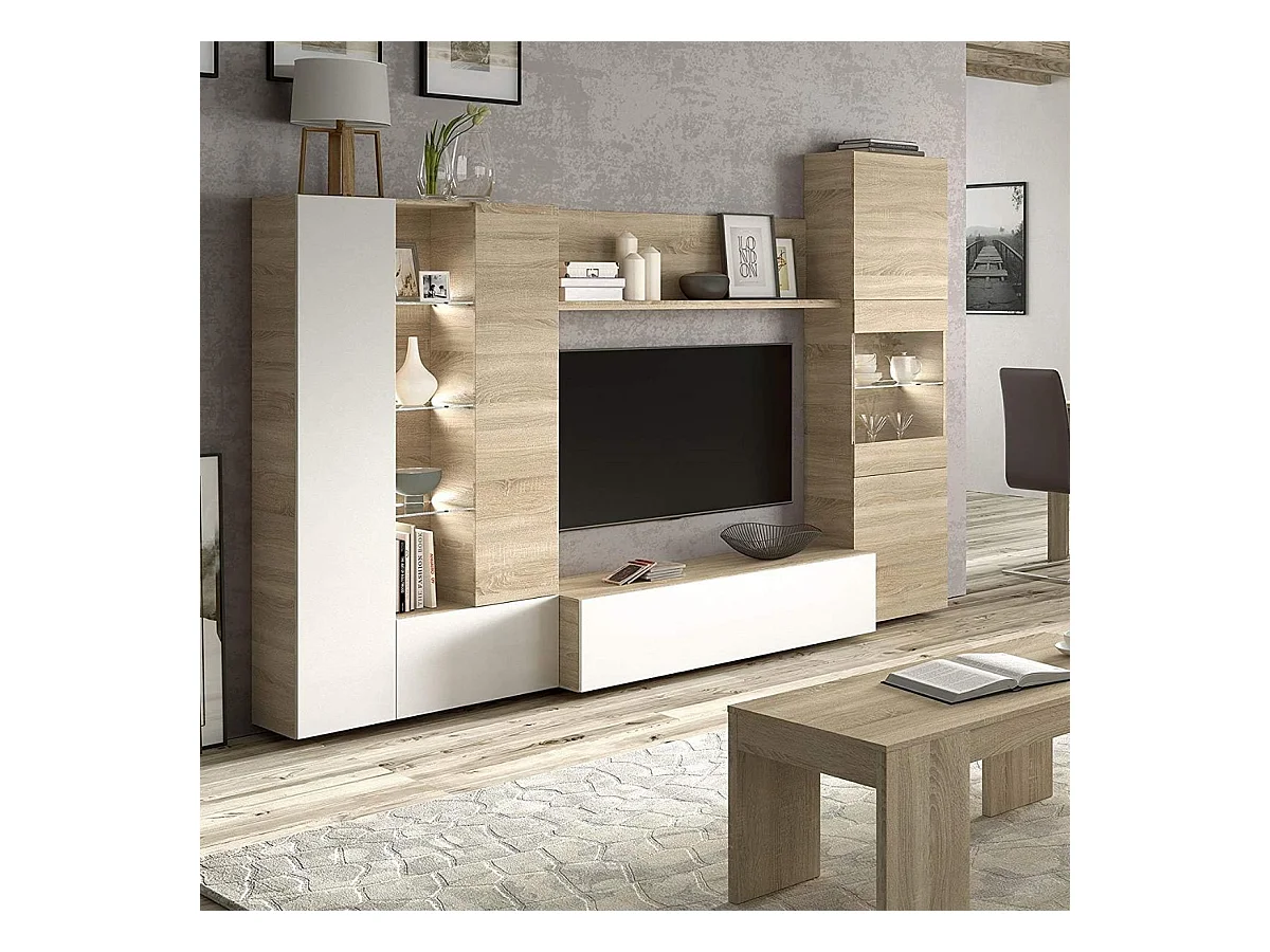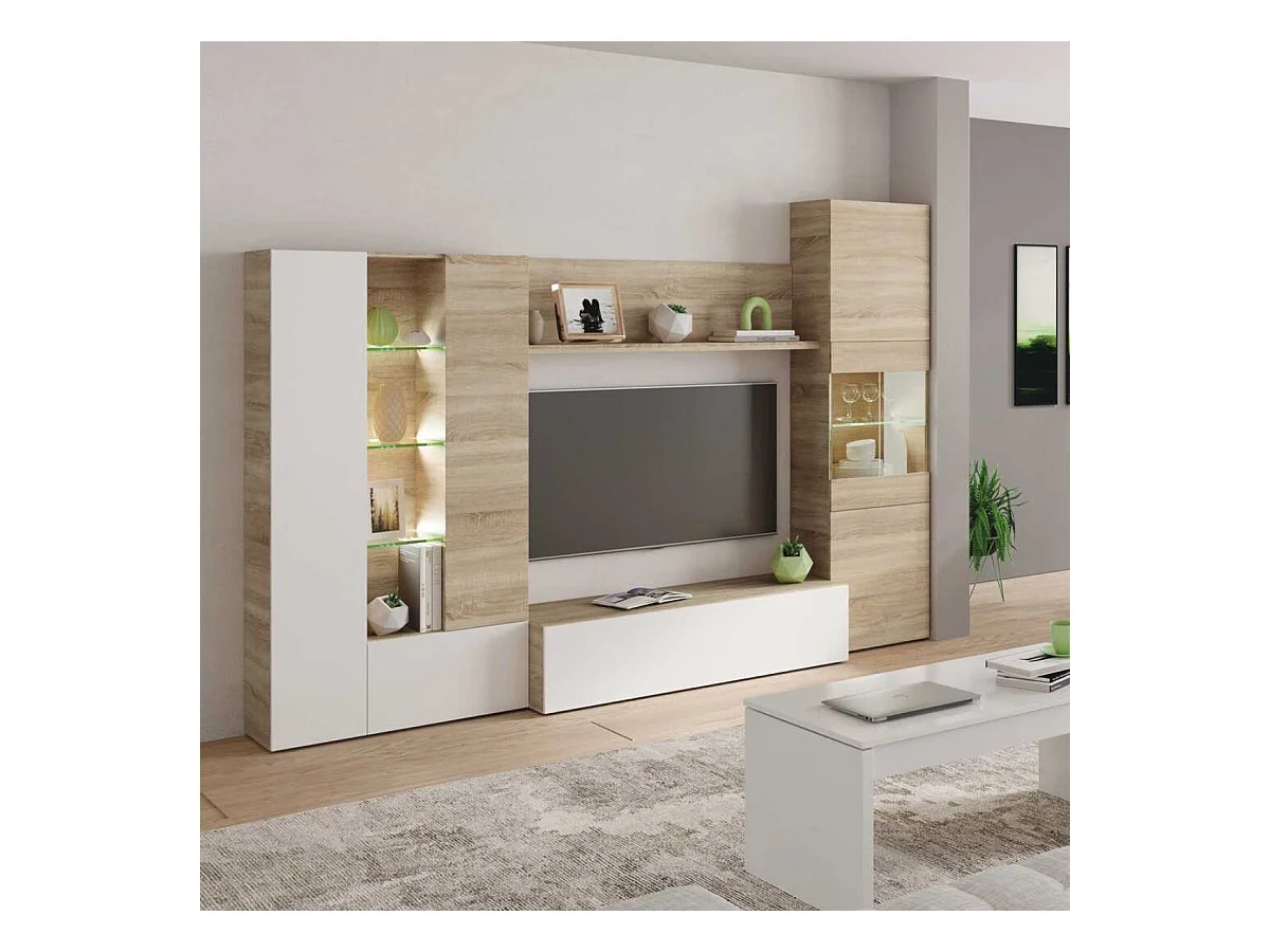 Meuble TV LED Blanc Brillant et Chêne - Salon Moderne 260 cm