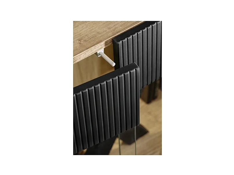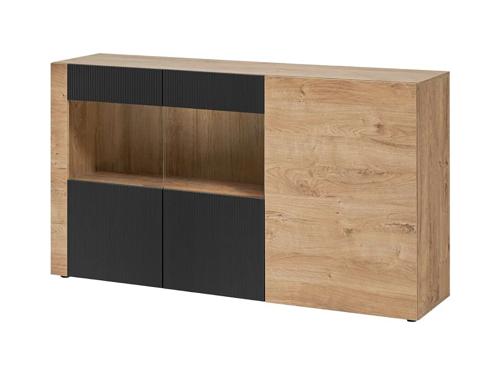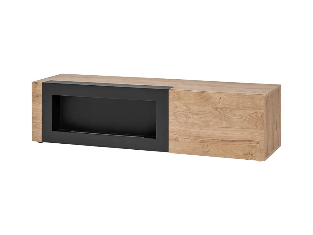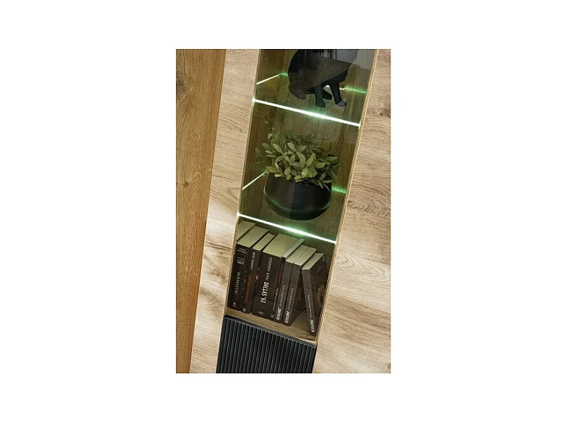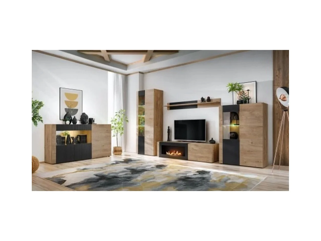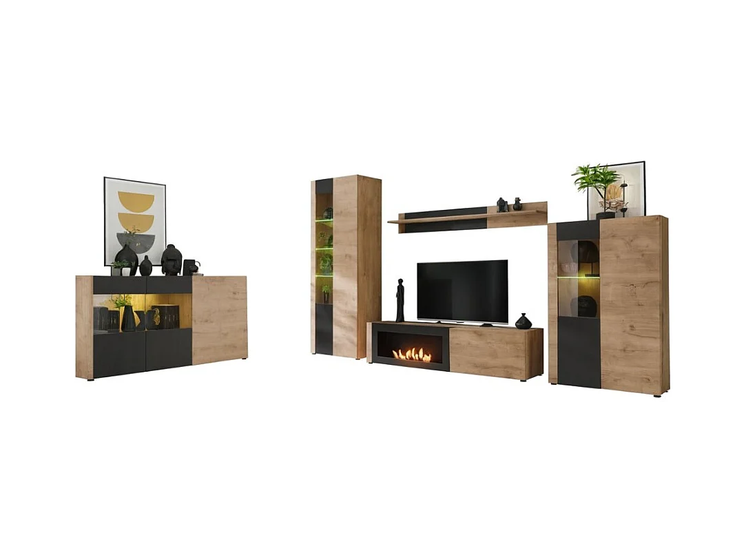 Salon complet DOUM – Buffet bas, vitrine, meuble TV avec cheminée bio-éthanol, buffet haut et étagère murale – Chêne clair et no