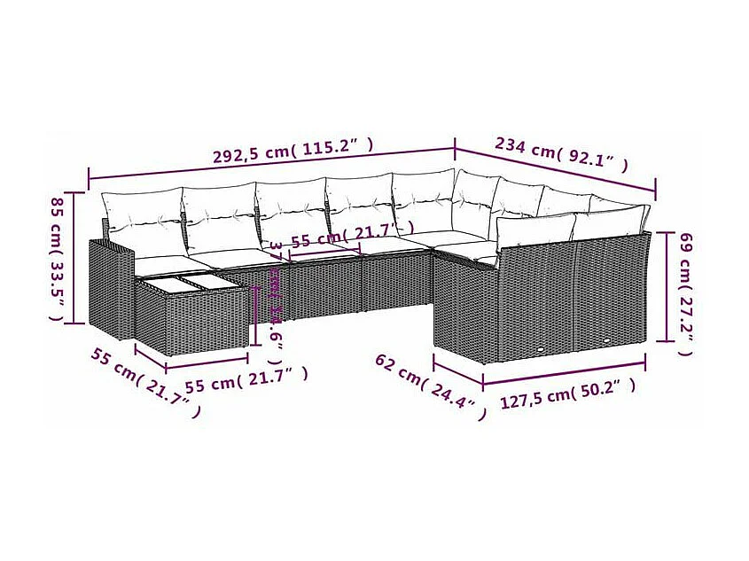 Salon de jardin 10 pcs avec coussins marron résine tressée