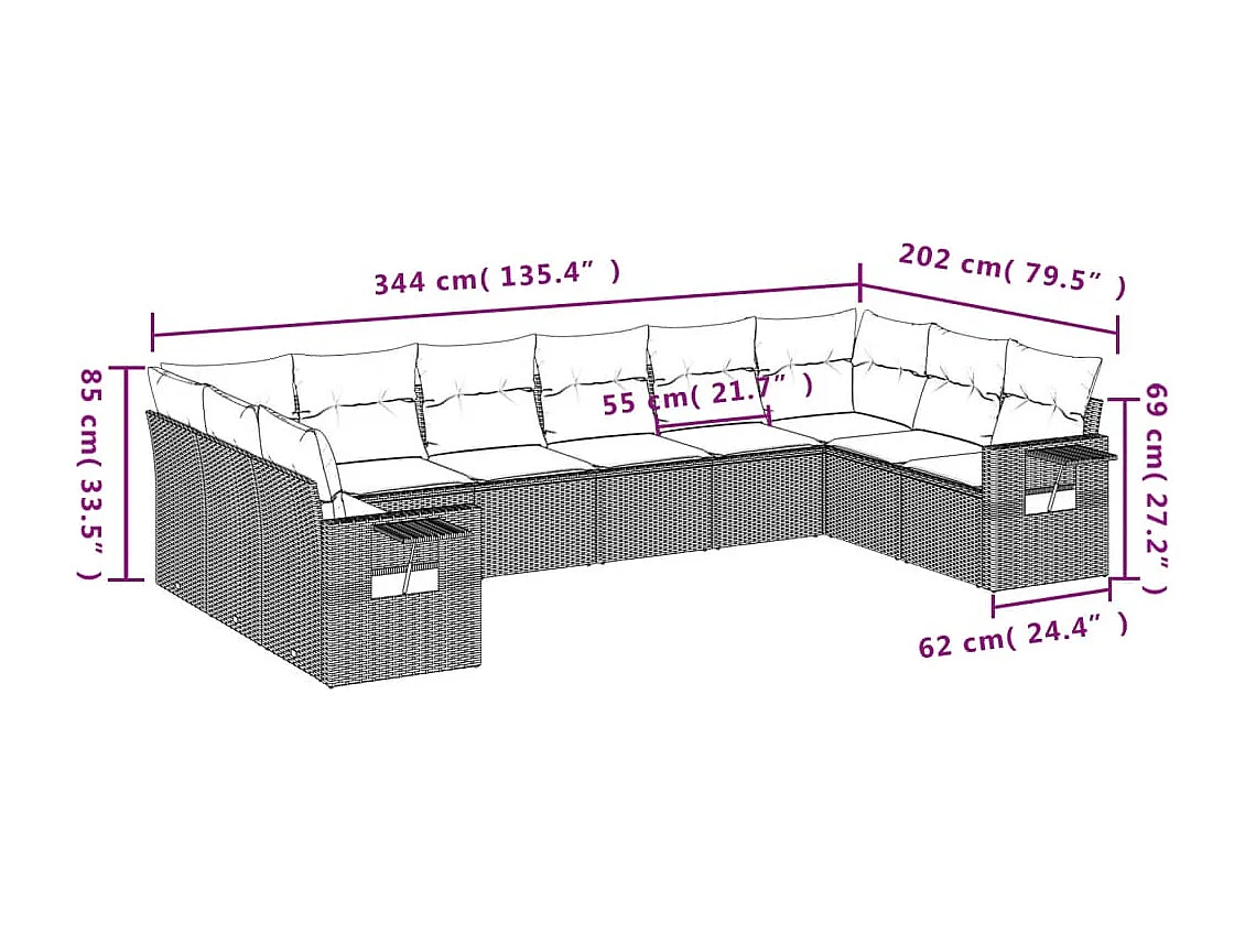 Salon de jardin 10 pcs avec coussins marron résine tressée