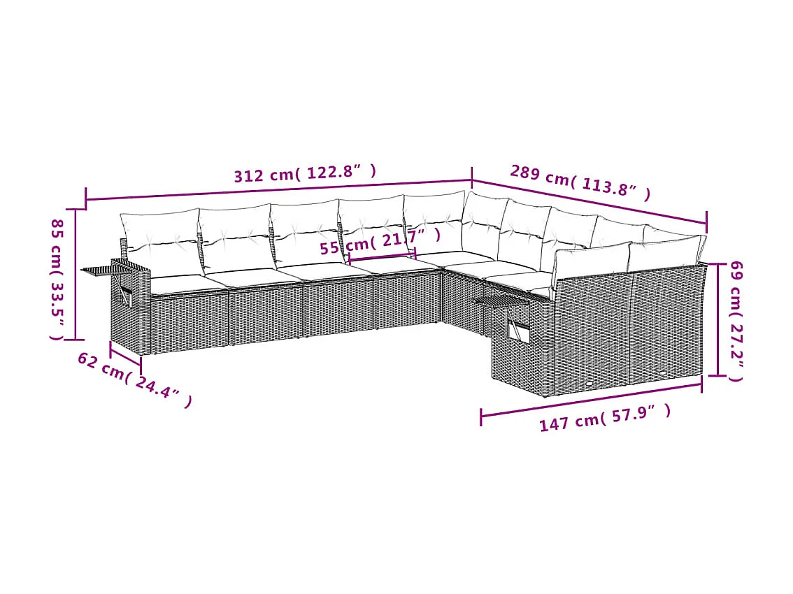 Salon de jardin 10 pcs avec coussins marron résine tressée