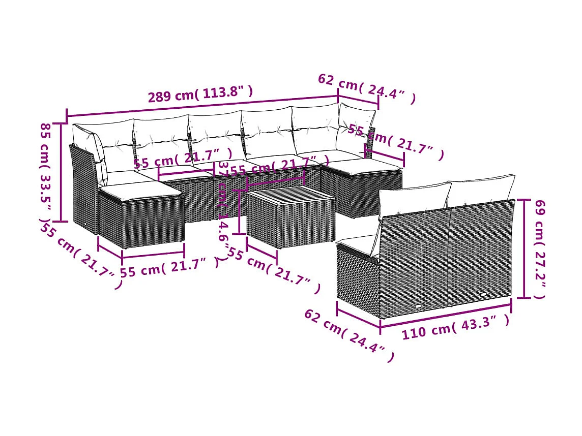 Salon de jardin 10 pcs avec coussins noir résine tressée