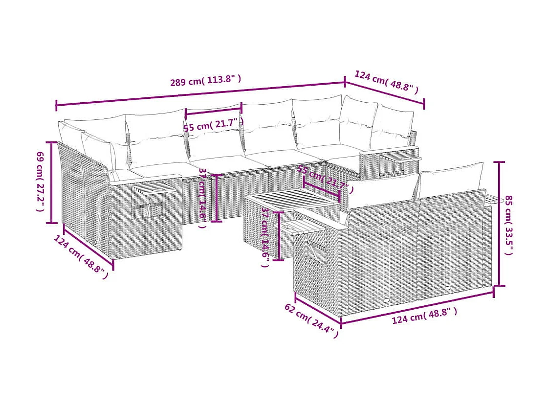 Salon de jardin 10 pcs avec coussins noir résine tressée