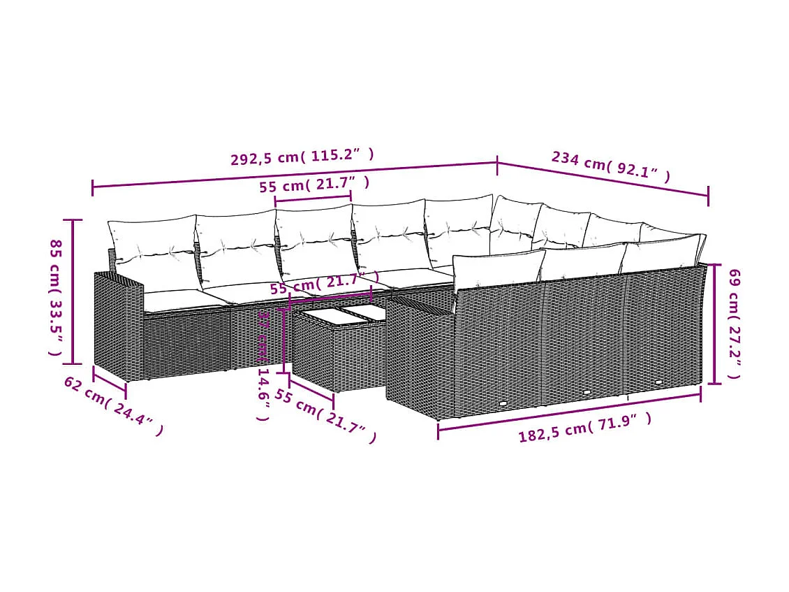 Salon de jardin 11 pcs avec coussins gris clair résine tressée