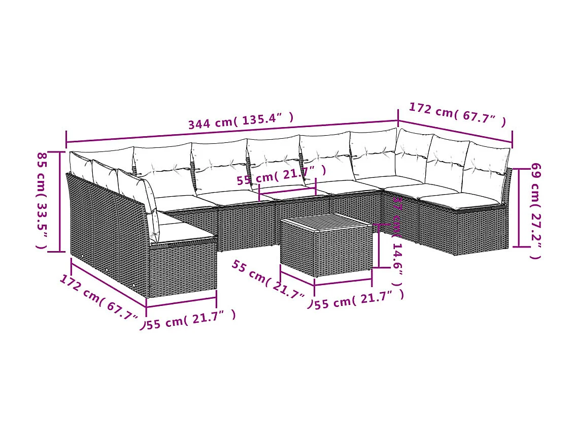 Salon de jardin 11 pcs avec coussins gris résine tressée
