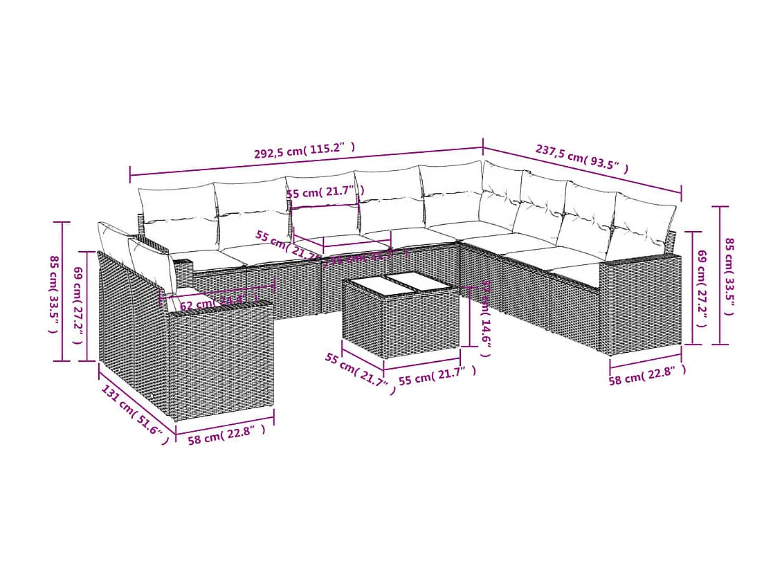 Salon de jardin 11 pcs avec coussins gris résine tressée