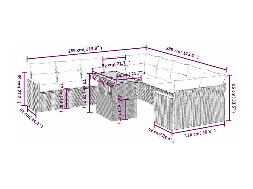 Salon de jardin 11 pcs avec coussins gris résine tressée