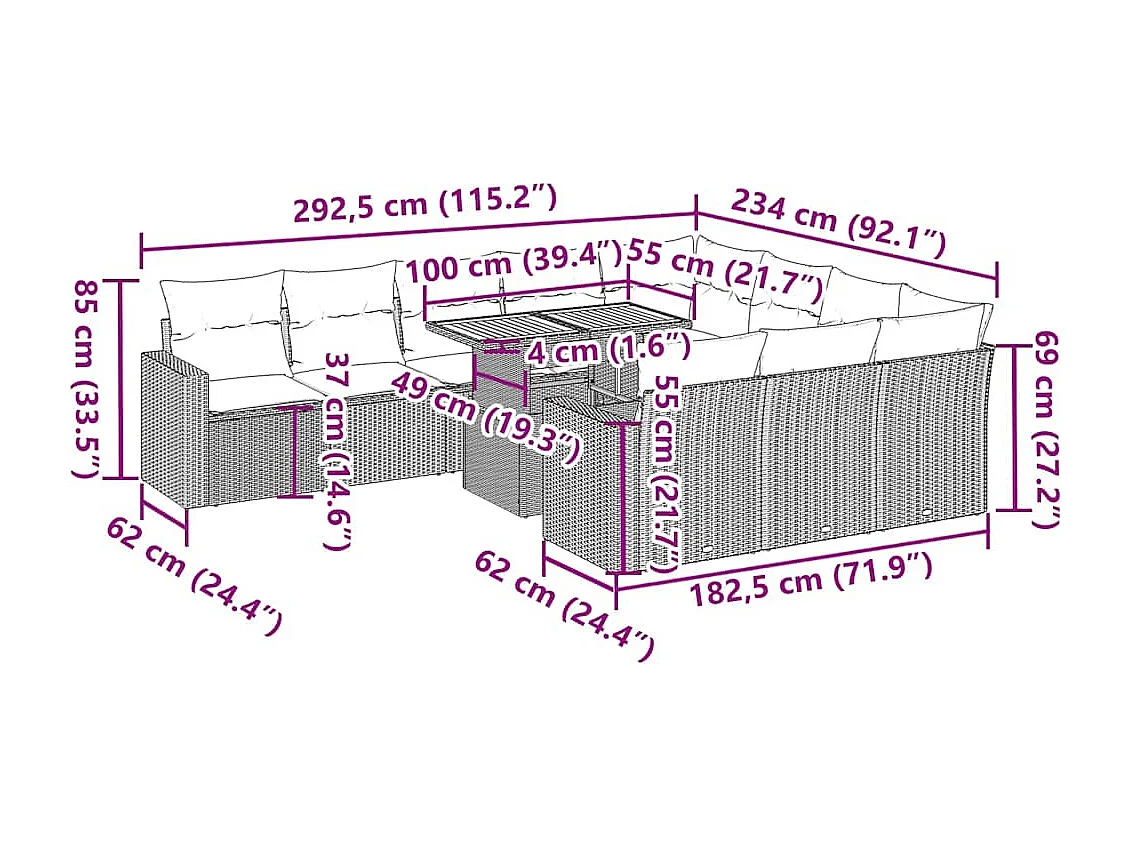 Salon de jardin 11 pcs avec coussins gris résine tressée