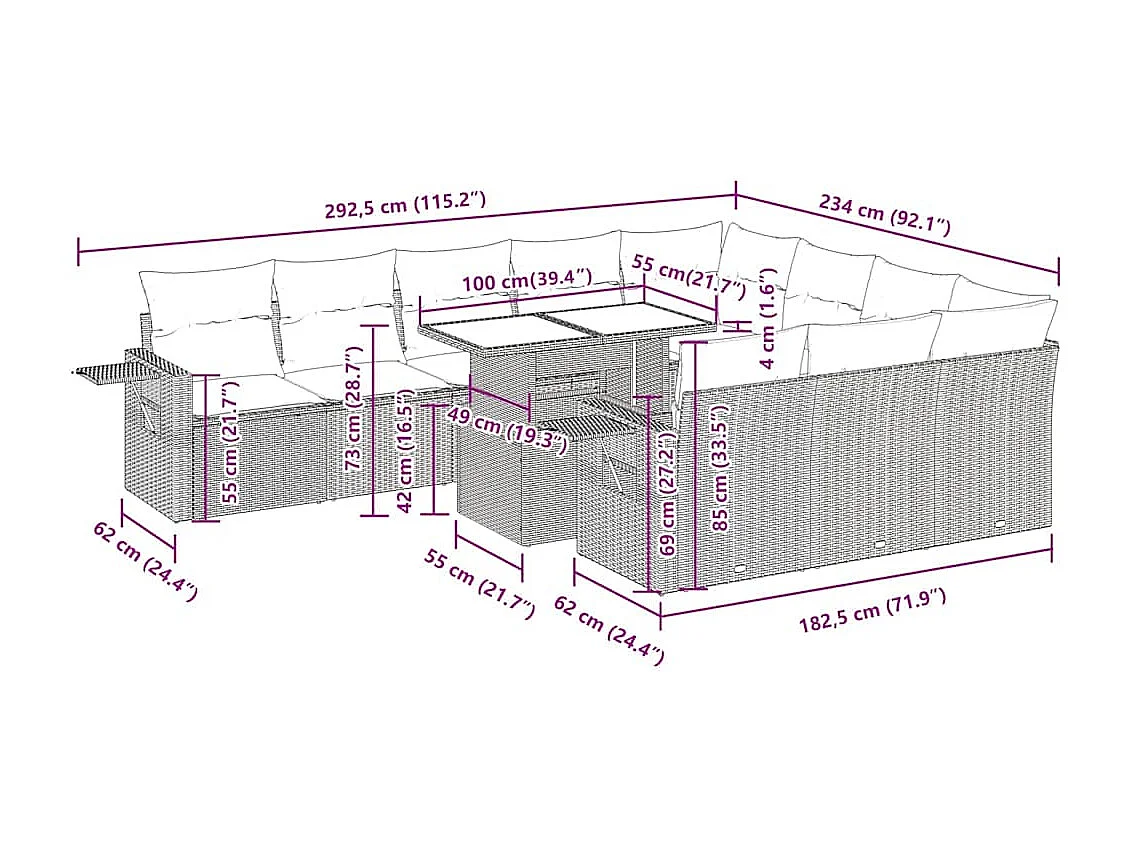 Salon de jardin 11 pcs avec coussins gris résine tressée