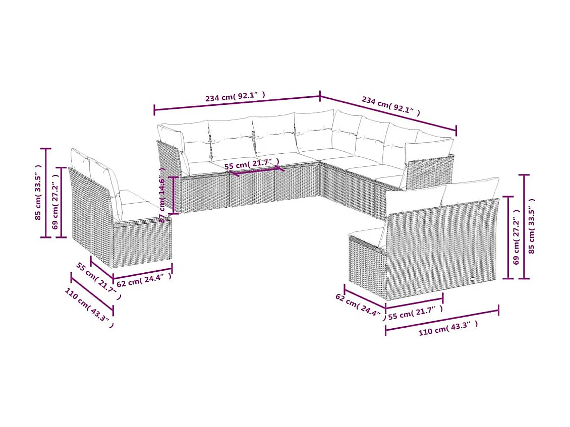 Salon de jardin 11 pcs avec coussins noir résine tressée