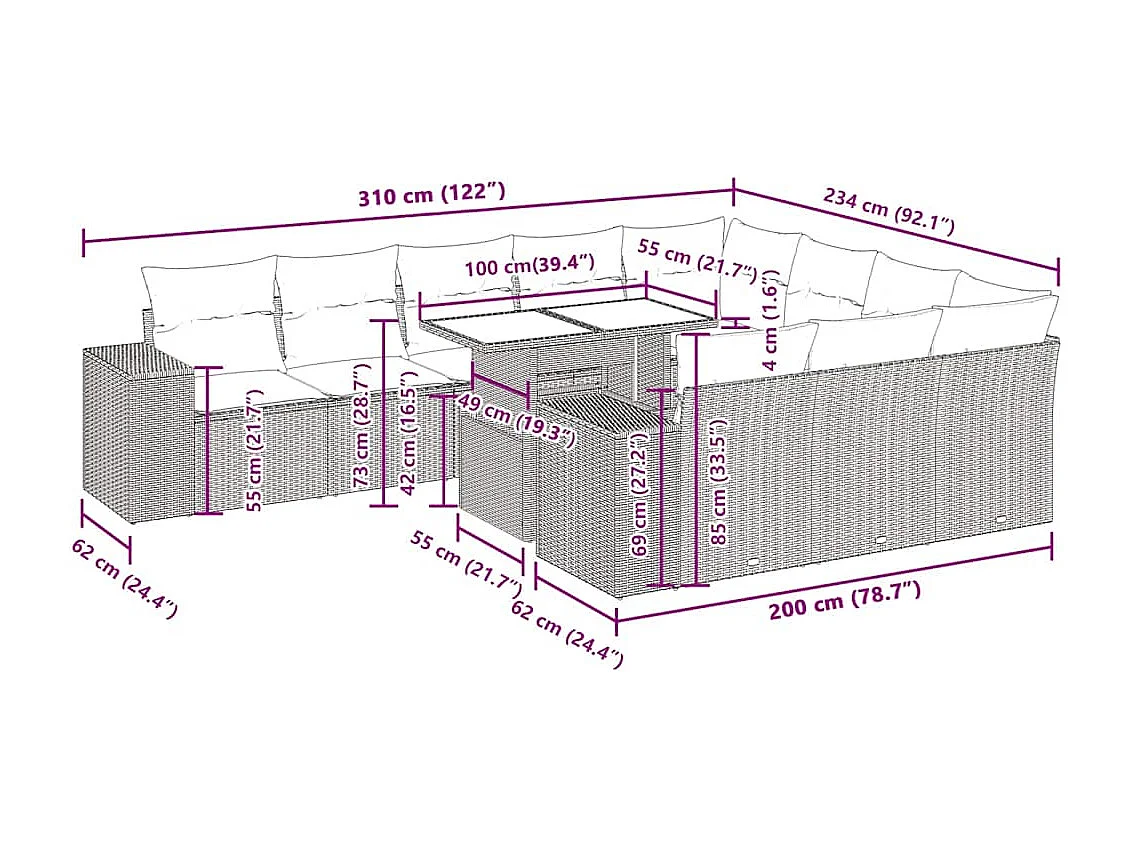 Salon de jardin 11 pcs avec coussins noir résine tressée