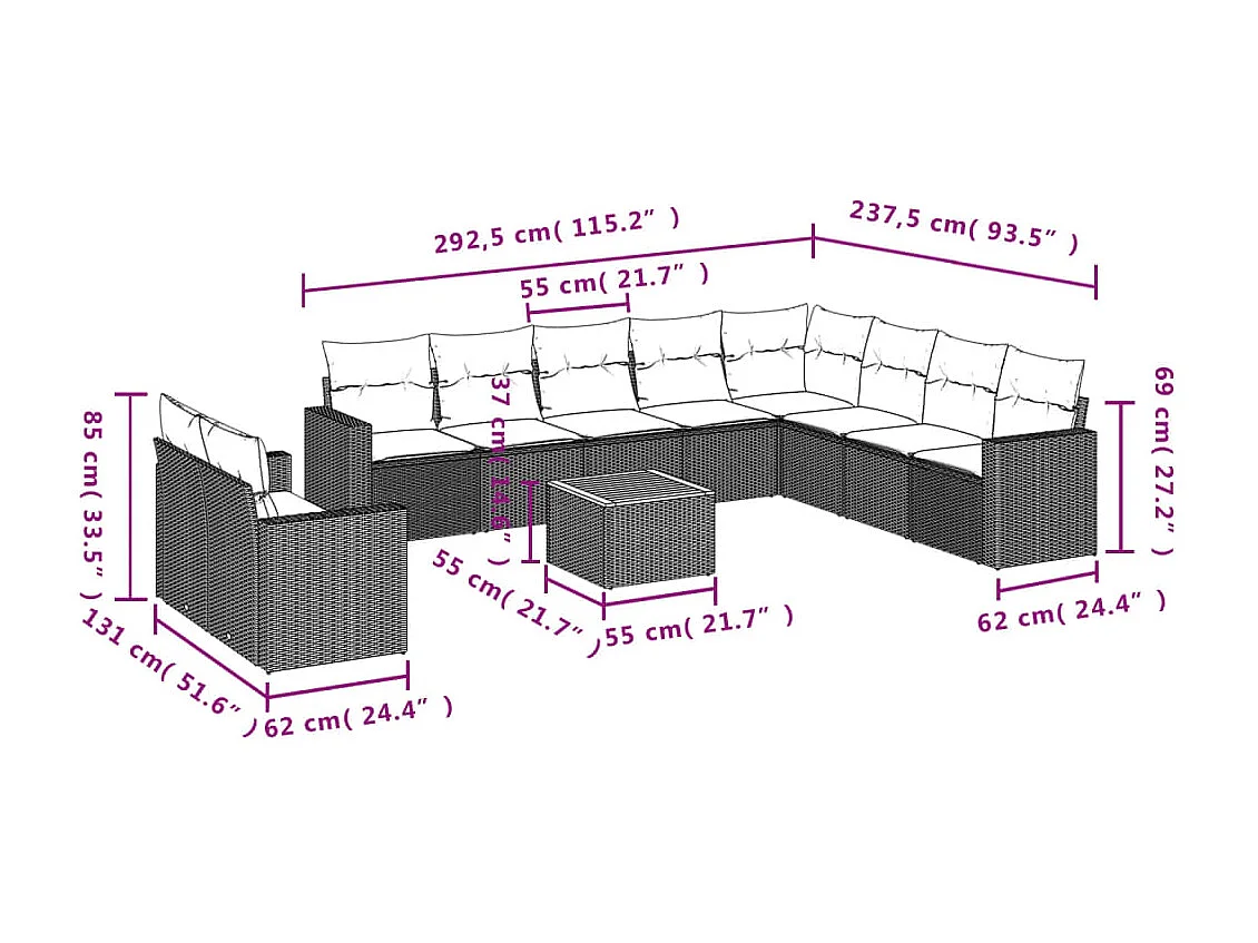 Salon de jardin 11 pcs avec coussins noir résine tressée