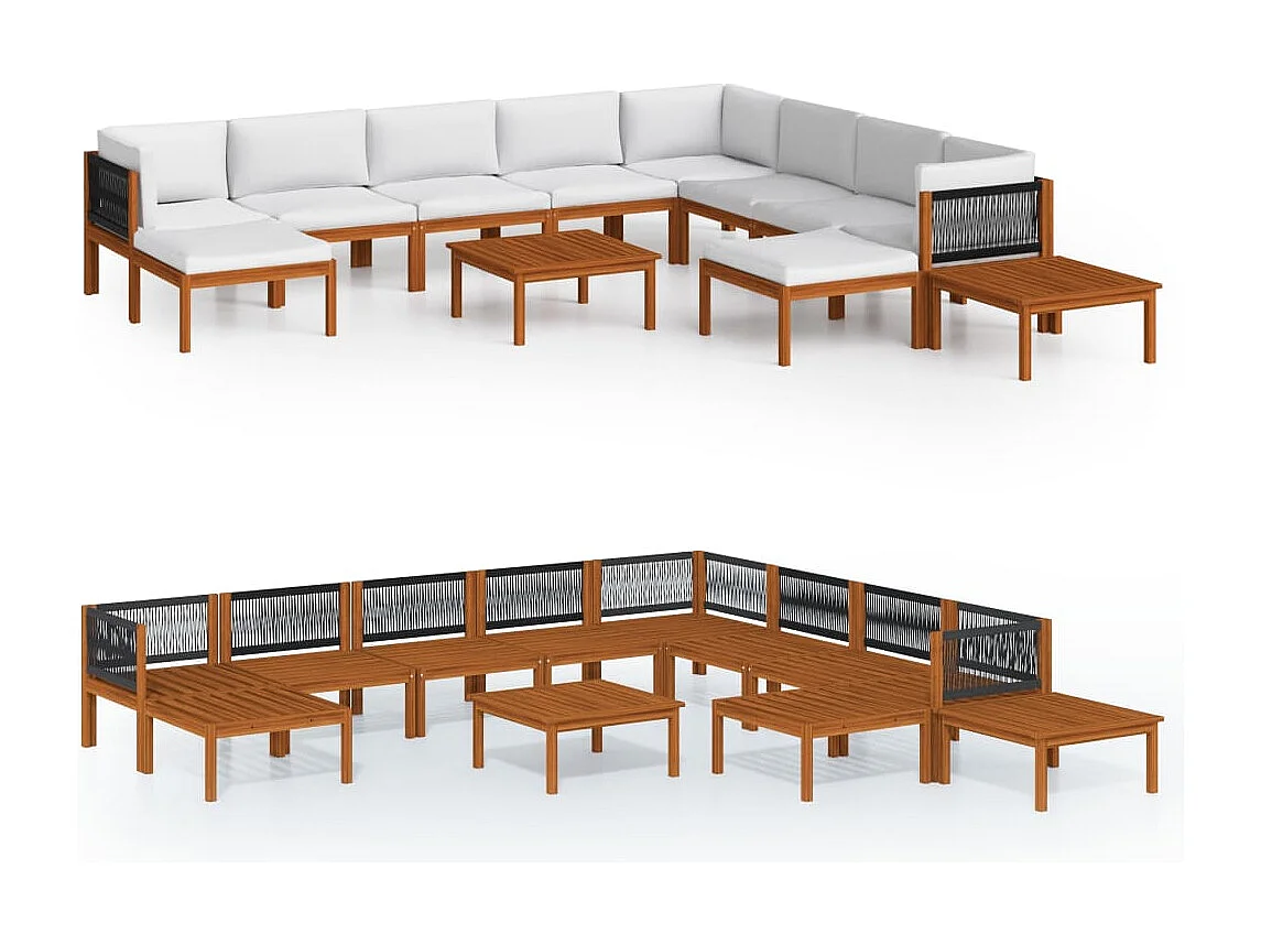 Salon de jardin 12 pièces avec coussins, bois d'acacia crème et corde