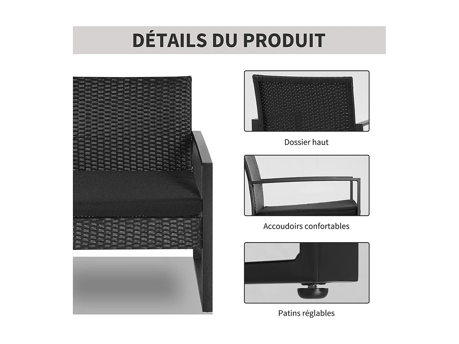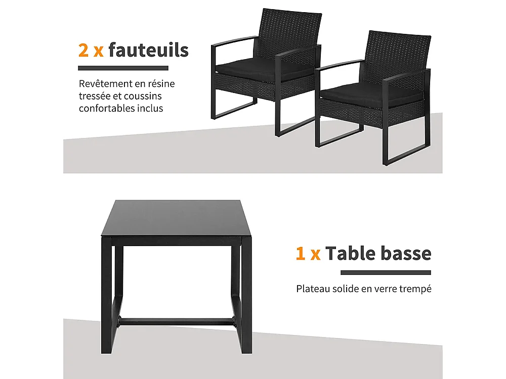 Salon de jardin 2 places 3 pièces 2 chaises avec coussins + table basse plateau verre trempé résine tressée 4 fils imitation rotin noir