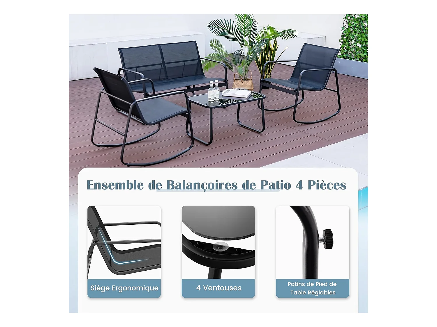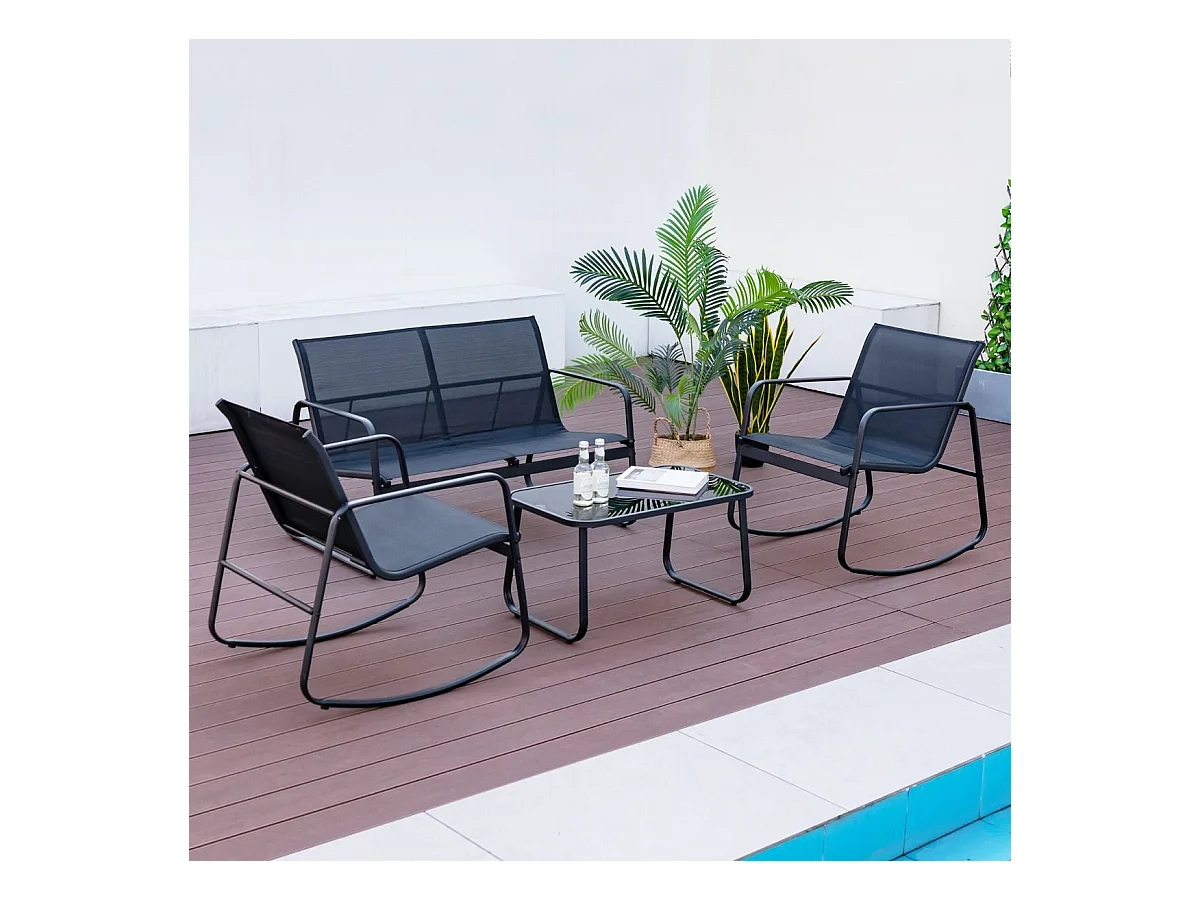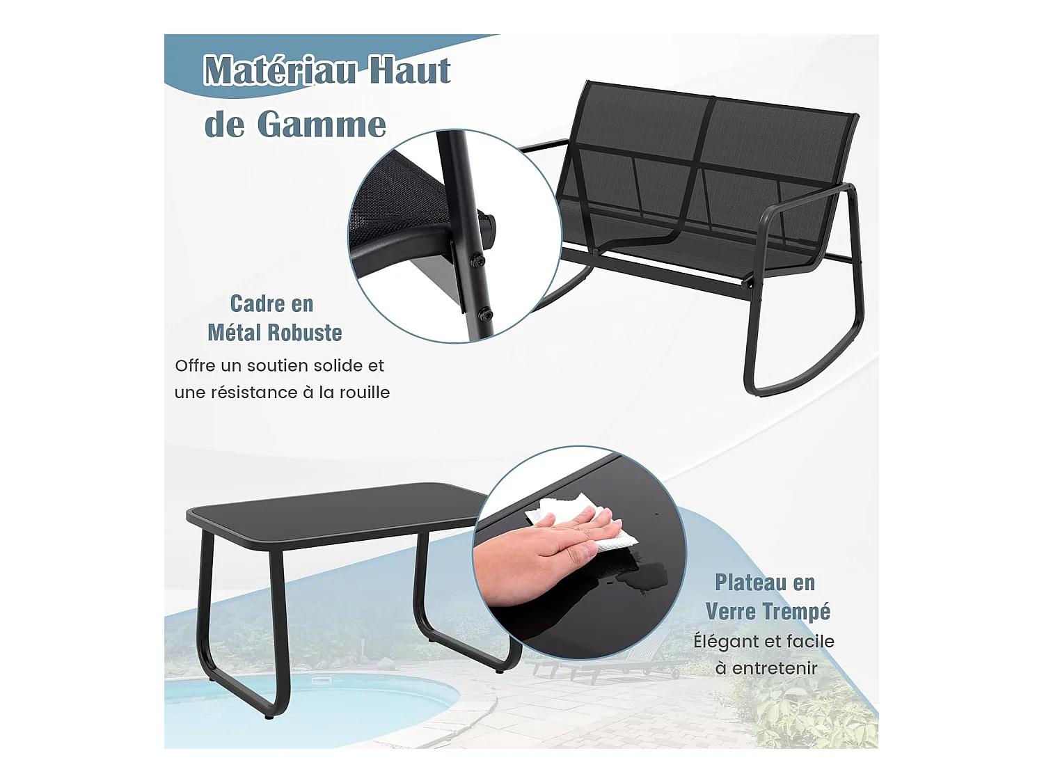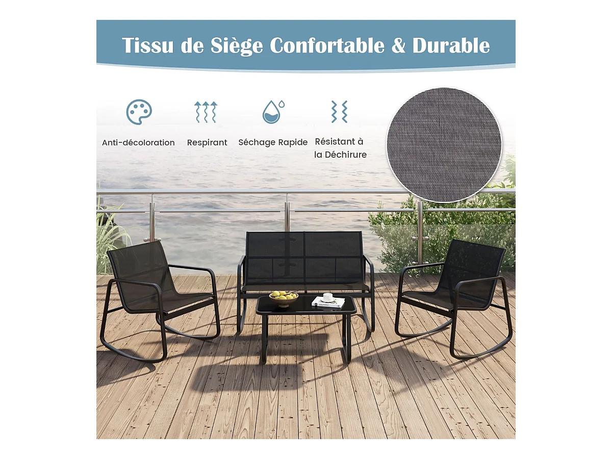 Salon de Jardin 4 Pièces avec Chaises à Bascule Table en Verre et Causeuse, Ensemble de Meuble Extérieur Cadre Métallique Charge 150KG, pour Porche Bord de Piscine Balcon, Noir