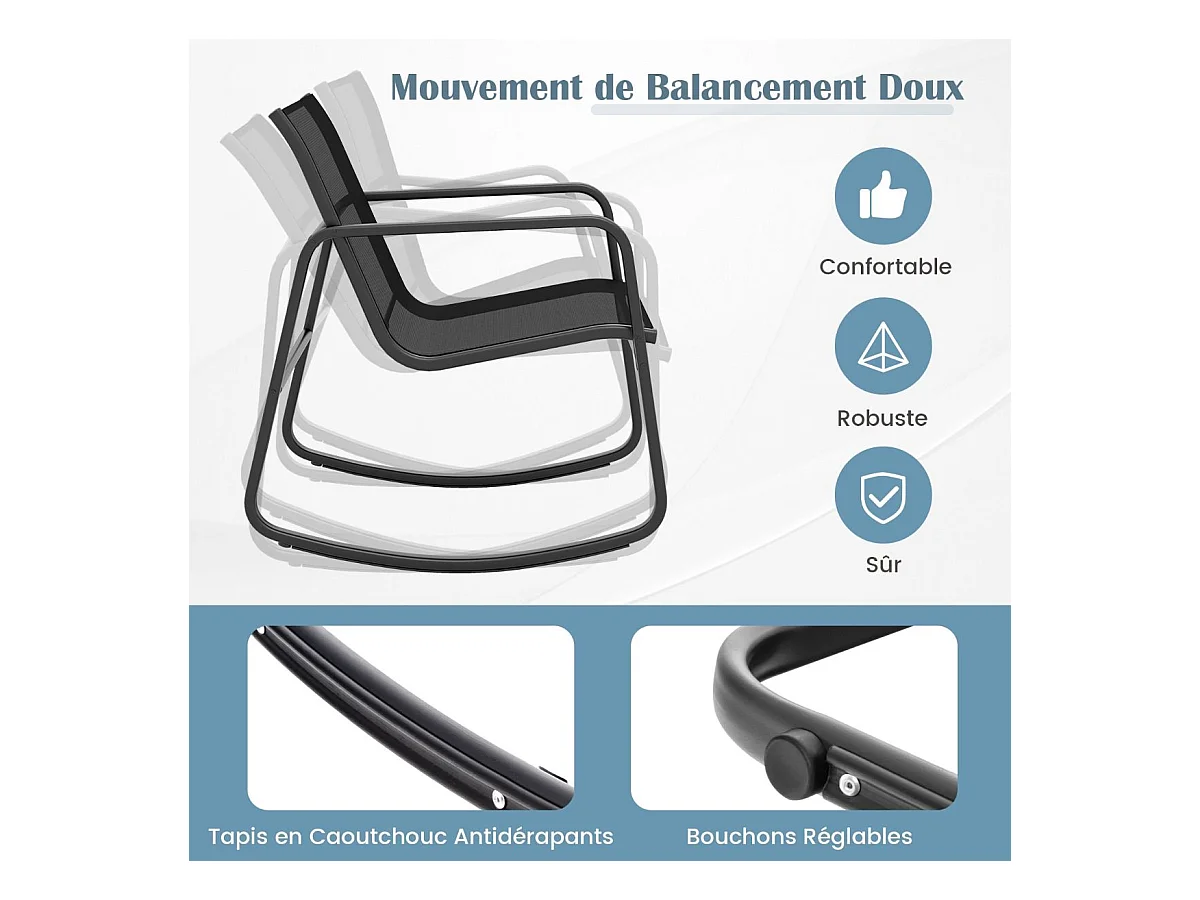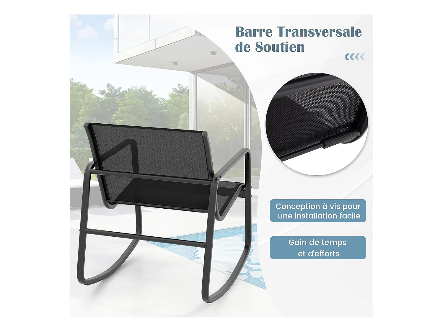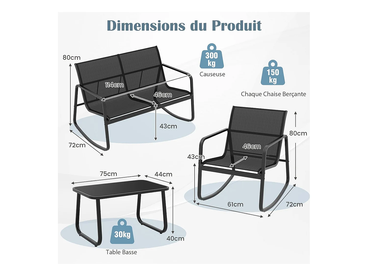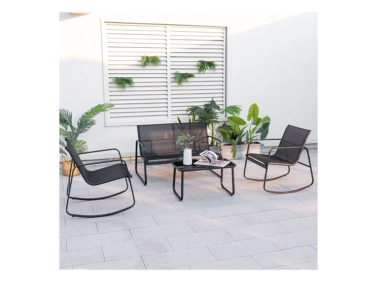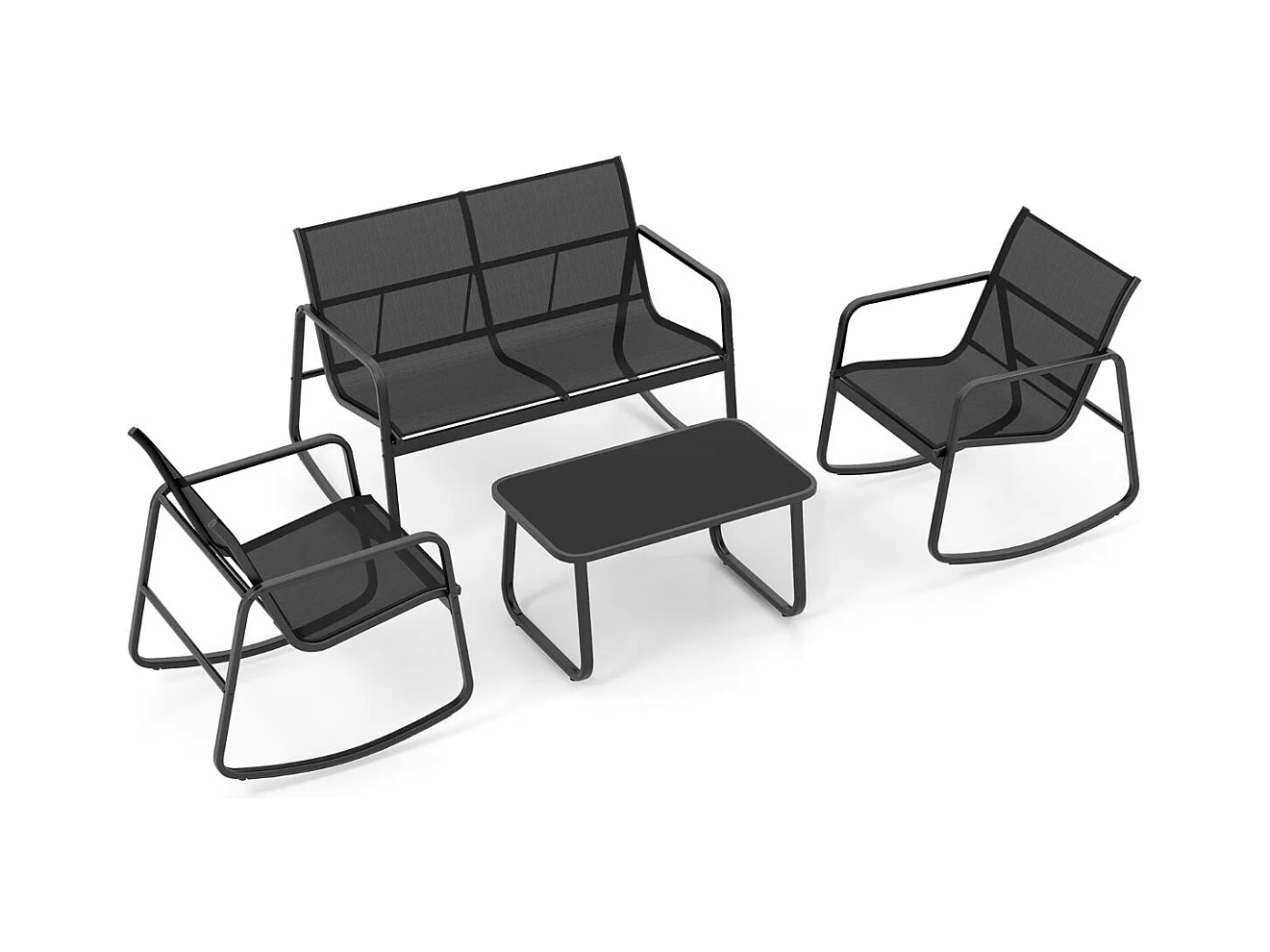 Salon de Jardin 4 Pièces avec Chaises à Bascule Table en Verre et Causeuse, Ensemble de Meuble Extérieur Cadre Métallique Charge 150KG, pour Porche Bord de Piscine Balcon, Noir