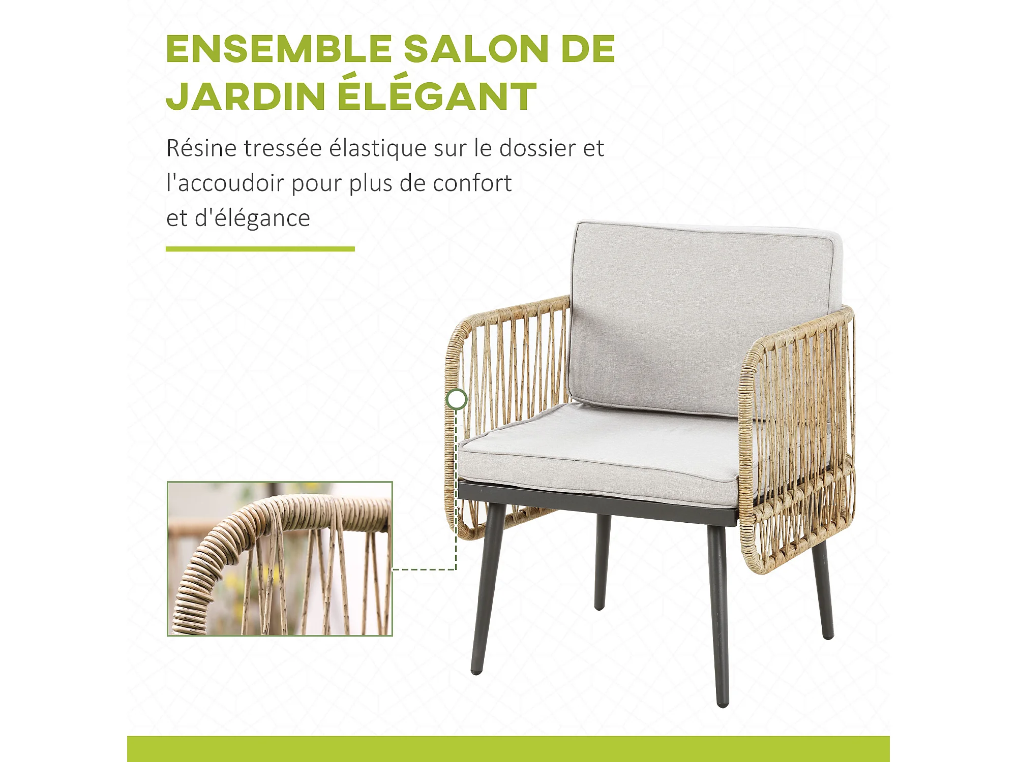 Salon de jardin 4 places 4 pièces style colonial table basse coussins beige inclus résine tressée aspect rotin