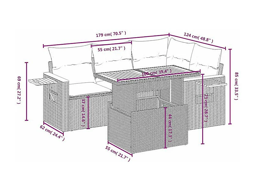 Salon de jardin 5 pcs avec coussins gris résine tressée