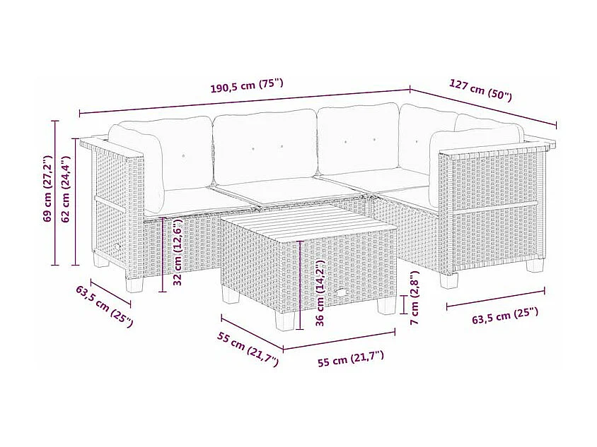 Salon de jardin 5 pcs avec coussins gris résine tressée