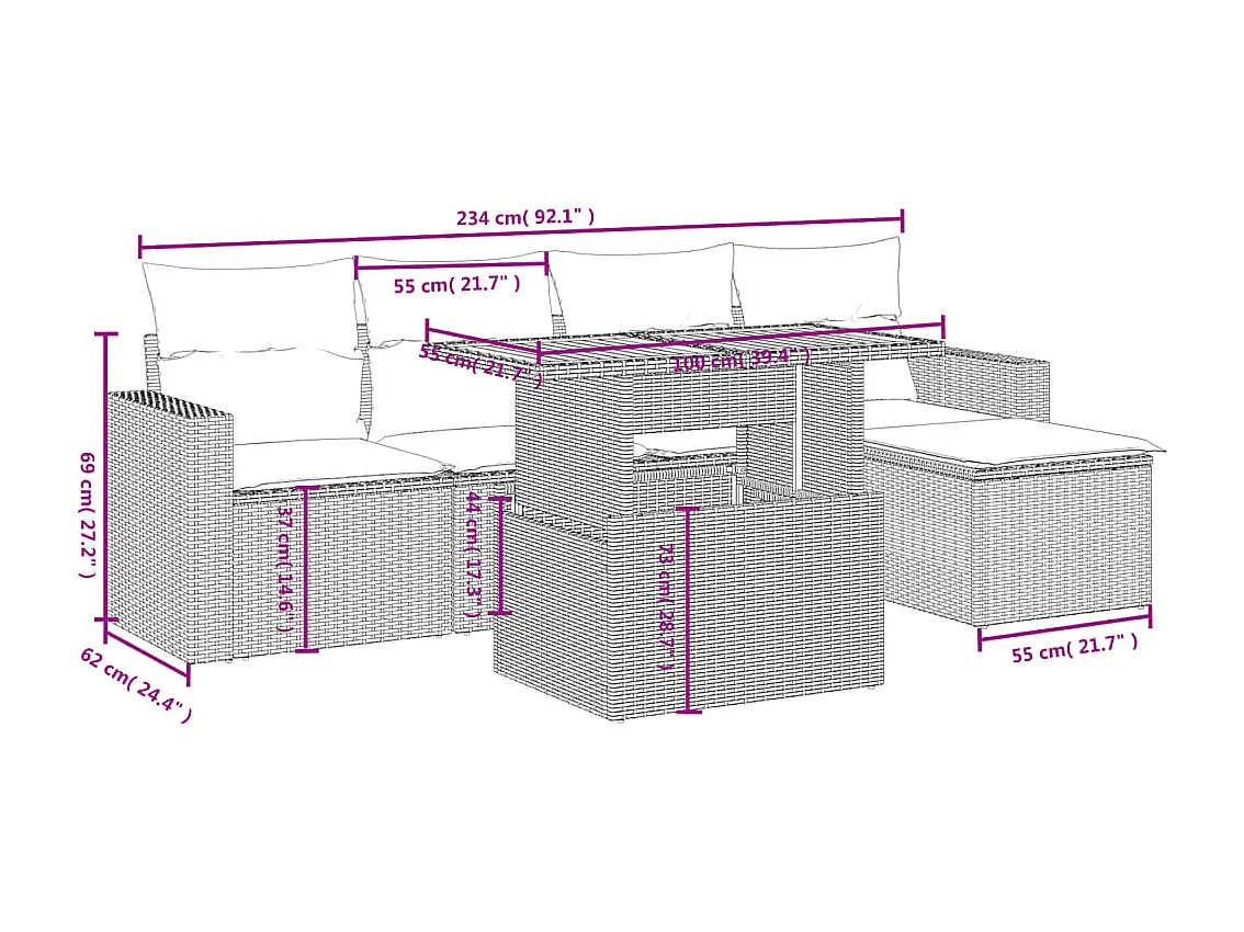 Salon de jardin 6 pcs avec coussins gris résine tressée